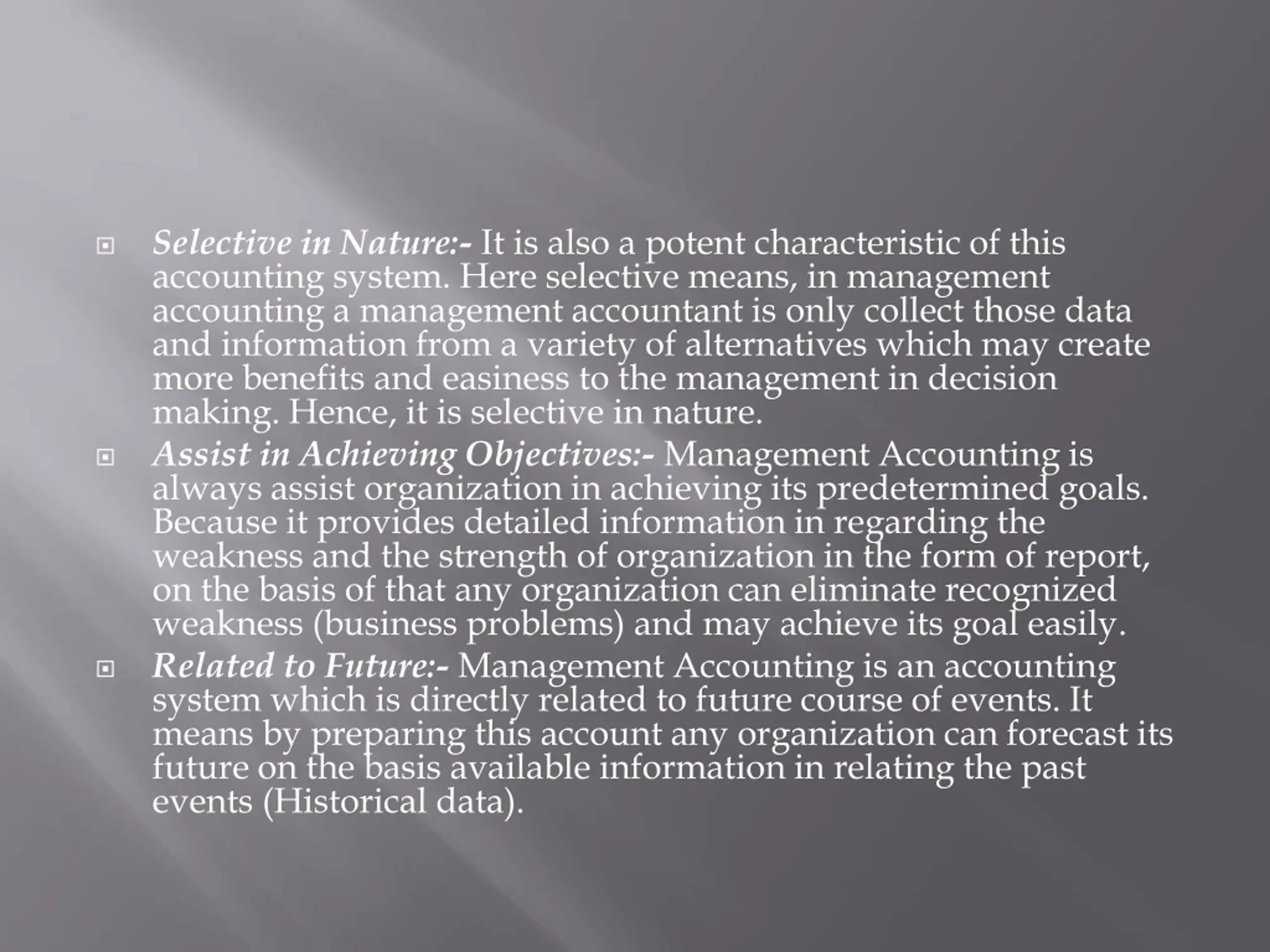 Selective in Nature:- It is also a potent characteristic of this accounting system. Here selective means, in management accounting a management accountant is only collect those data and information from a variety of alternatives which may create more benefits and easiness to the management in decision making. Hence, it is selective in nature. Assist in Achieving Objectives:- Management Accounting is always assist organization in achieving its predetermined goals. Because it provides detailed information in regarding the weakness and the strength of organization in the form of report, on the basis of that any organization can eliminate recognized weakness (business problems) and may achieve its goal easily. Related to Future:- Management Accounting is an accounting system which is directly related to future course of events. It means by preparing this account any organization can forecast its future on the basis available information in relating the past events (Historical data).