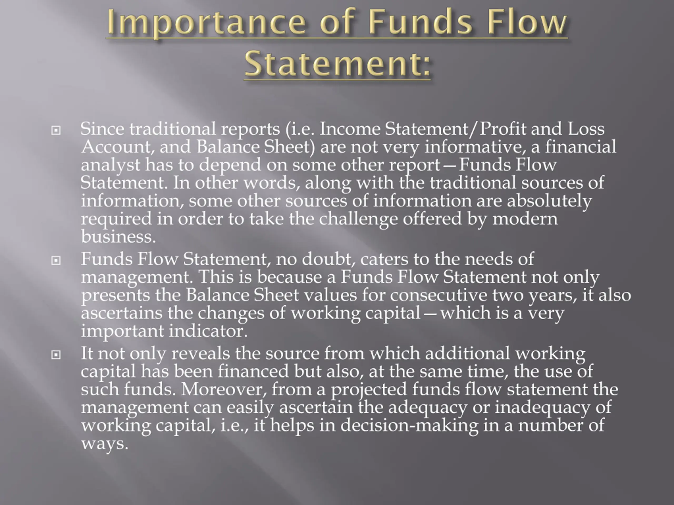 Since traditional reports (i.e. Income Statement/Profit and Loss Account, and Balance Sheet) are not very informative, a financial analyst has to depend on some other report Funds Flow Statement. In other words, along with the traditional sources of information, some other sources of information are absolutely required in order to take the challenge offered by modern business. Funds Flow Statement, no doubt, caters to the needs of management. This is because a Funds Flow Statement not only presents the Balance Sheet values for consecutive two years, it also ascertains the changes of working capital which is a very important indicator. It not only reveals the source from which additional working capital has been financed but also, at the same time, the use of such funds. Moreover, from a projected funds flow statement the management can easily ascertain the adequacy or inadequacy of working capital, i.e., it helps in decision-making in a number of ways.