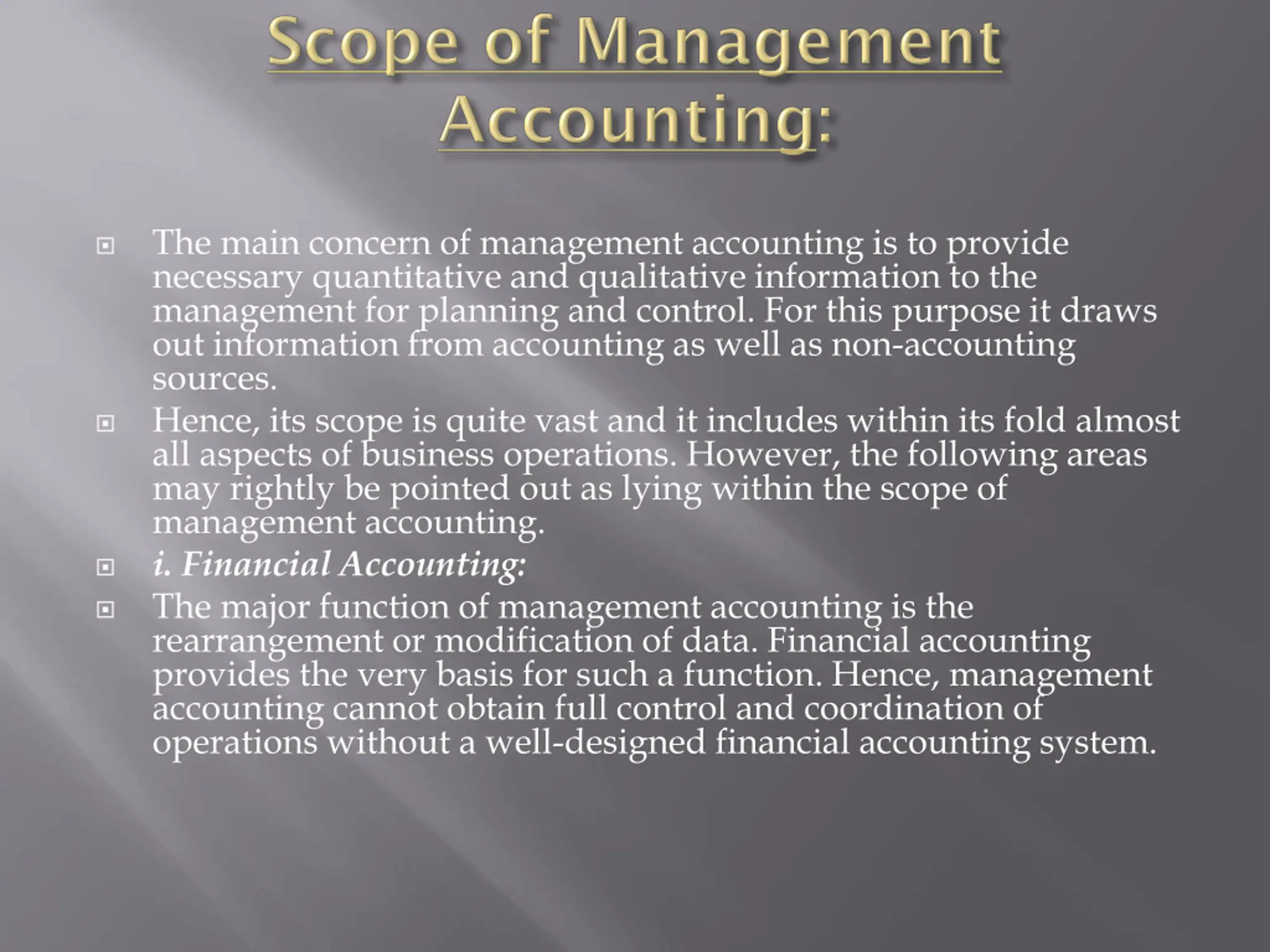 The main concern of management accounting is to provide necessary quantitative and qualitative information to the management for planning and control. For this purpose it draws out information from accounting as well as non-accounting sources. Hence, its scope is quite vast and it includes within its fold almost all aspects of business operations. However, the following areas may rightly be pointed out as lying within the scope of management accounting. i. Financial Accounting: The major function of management accounting is the rearrangement or modification of data. Financial accounting provides the very basis for such a function. Hence, management accounting cannot obtain full control and coordination of operations without a well-designed financial accounting system.