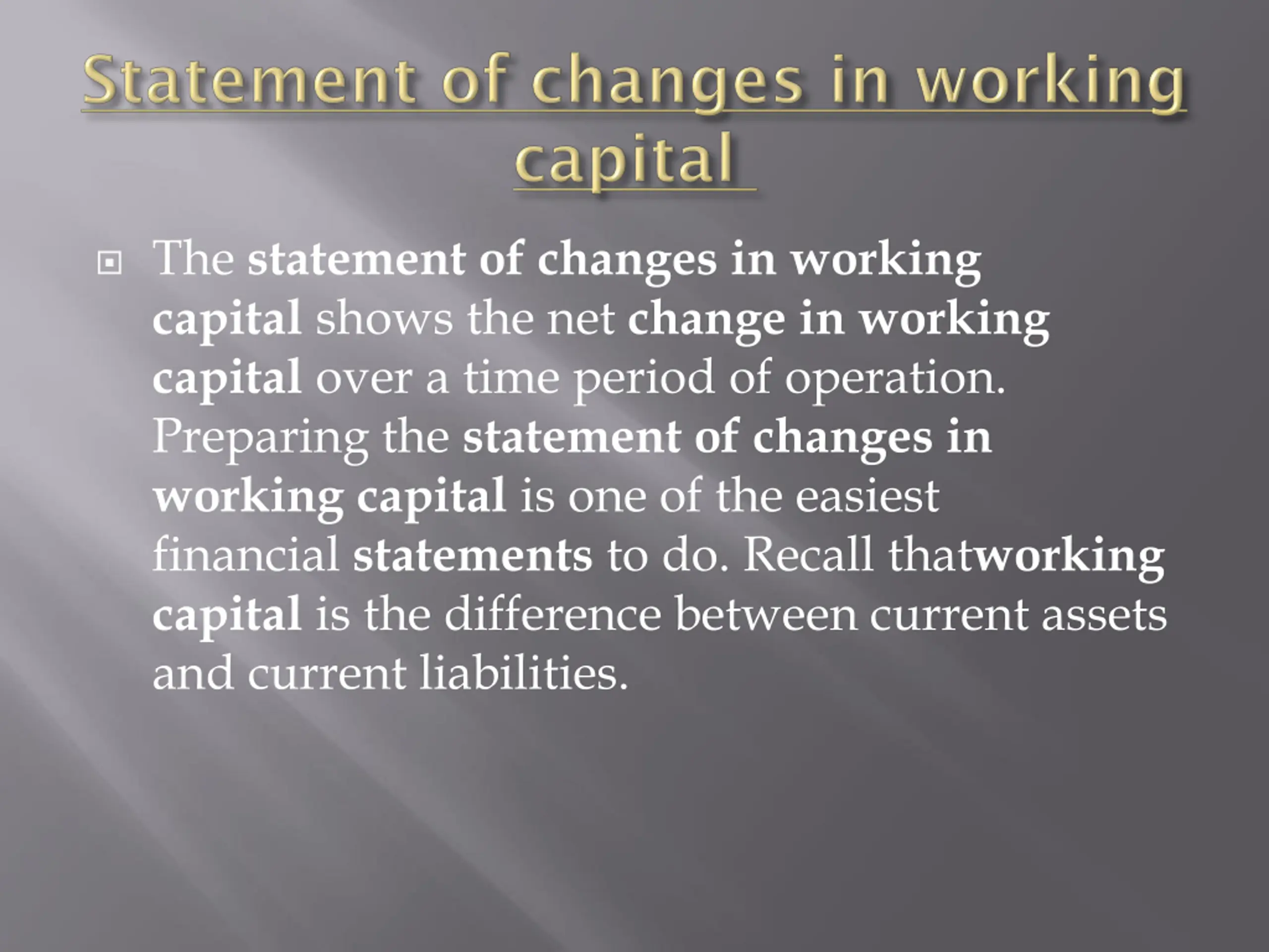 The statement of changes in working capital shows the net change in working capital over a time period of operation. Preparing the statement of changes in working capital is one of the easiest financial statements to do. Recall thatworking capital is the difference between current assets and current liabilities.