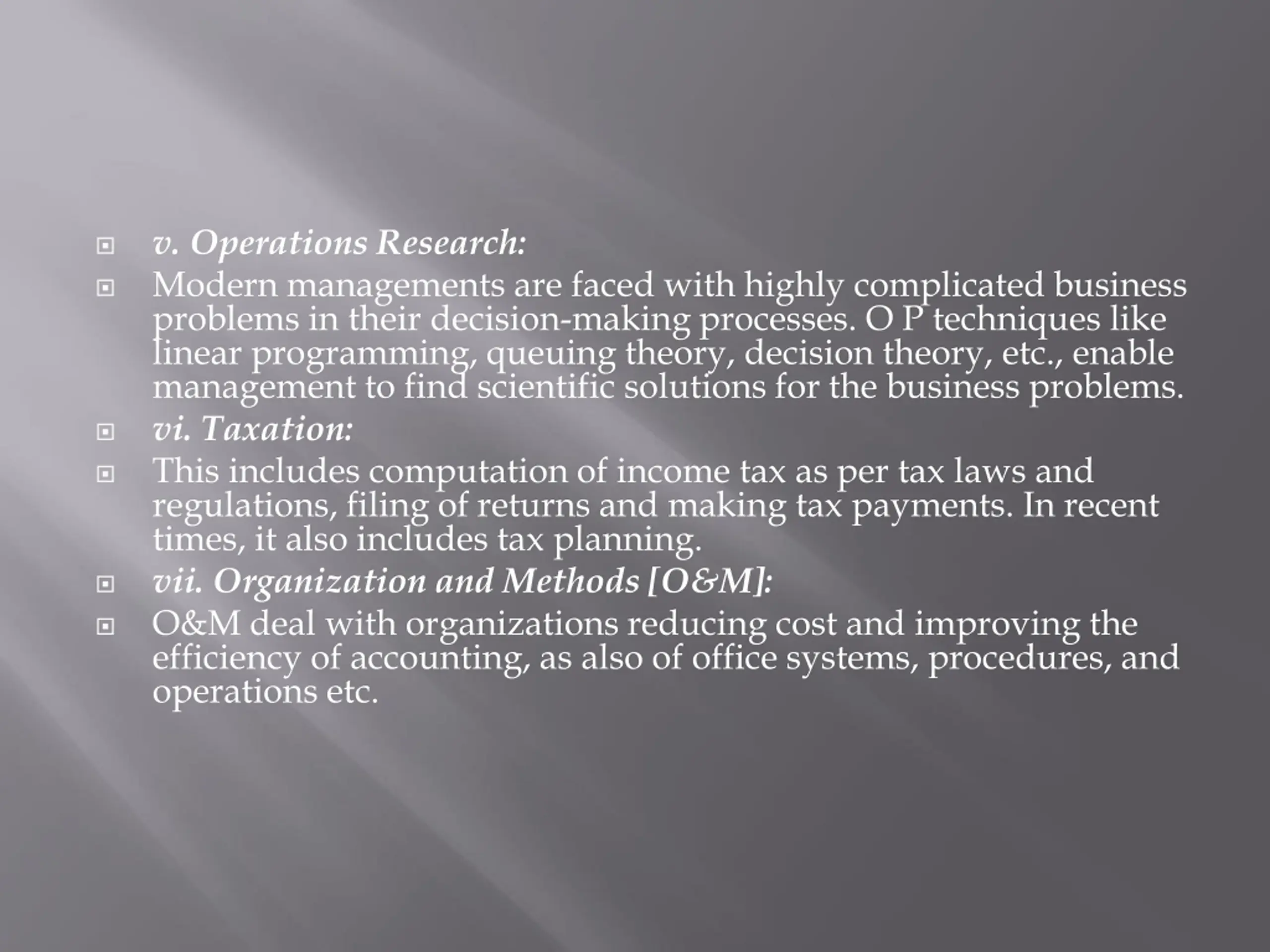 v. Operations Research: Modern managements are faced with highly complicated business problems in their decision-making processes. O P techniques like linear programming, queuing theory, decision theory, etc., enable management to find scientific solutions for the business problems. vi. Taxation: This includes computation of income tax as per tax laws and regulations, filing of returns and making tax payments. In recent times, it also includes tax planning. vii. Organization and Methods [O&M]: O&M deal with organizations reducing cost and improving the efficiency of accounting, as also of office systems, procedures, and operations etc.