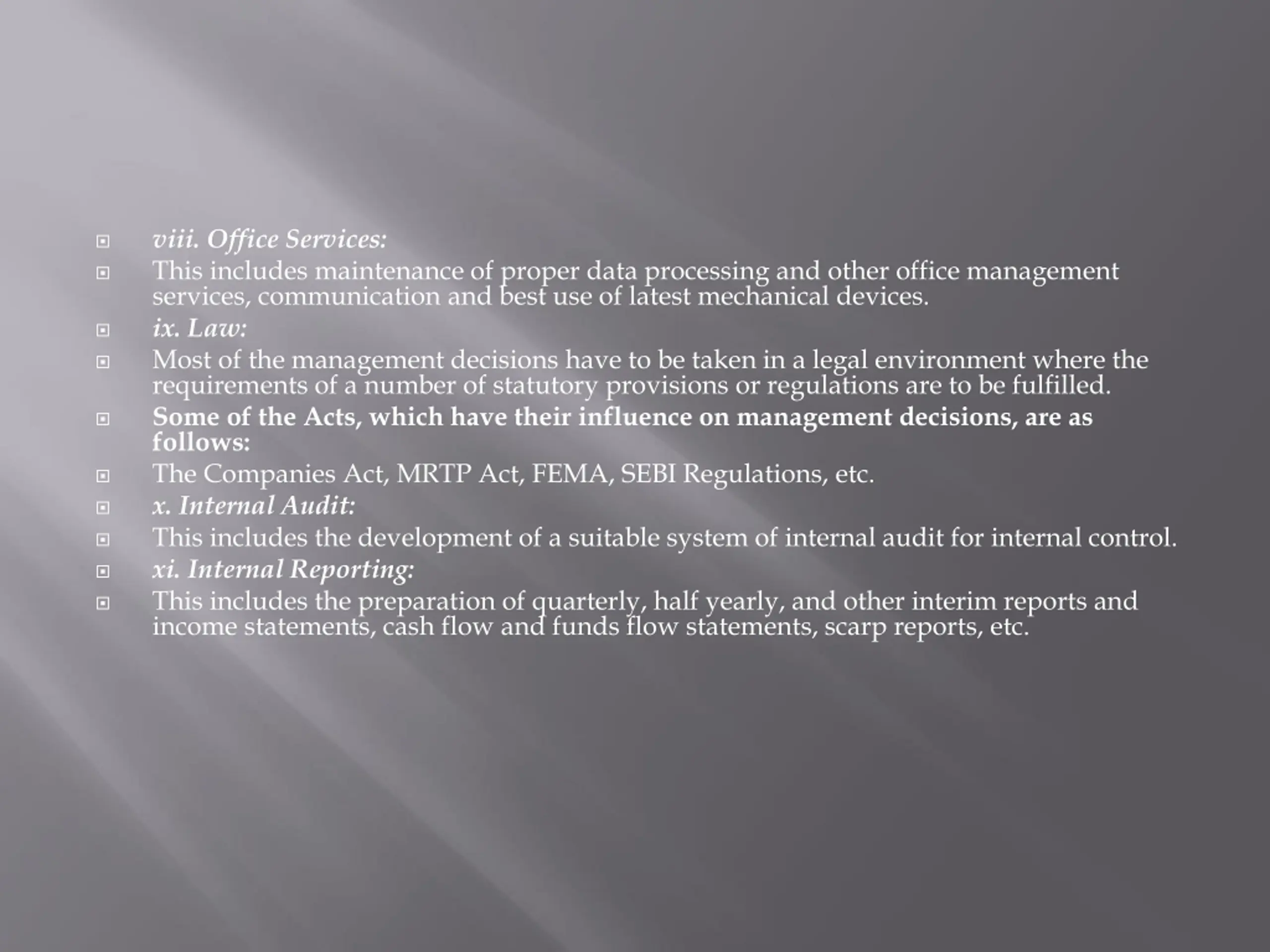 viii. Office Services: This includes maintenance of proper data processing and other office management services, communication and best use of latest mechanical devices. ix. Law: Most of the management decisions have to be taken in a legal environment where the requirements of a number of statutory provisions or regulations are to be fulfilled. Some of the Acts, which have their influence on management decisions, are as follows: The Companies Act, MRTP Act, FEMA, SEBI Regulations, etc. x. Internal Audit: This includes the development of a suitable system of internal audit for internal control. xi. Internal Reporting: This includes the preparation of quarterly, half yearly, and other interim reports and income statements, cash flow and funds flow statements, scarp reports, etc.