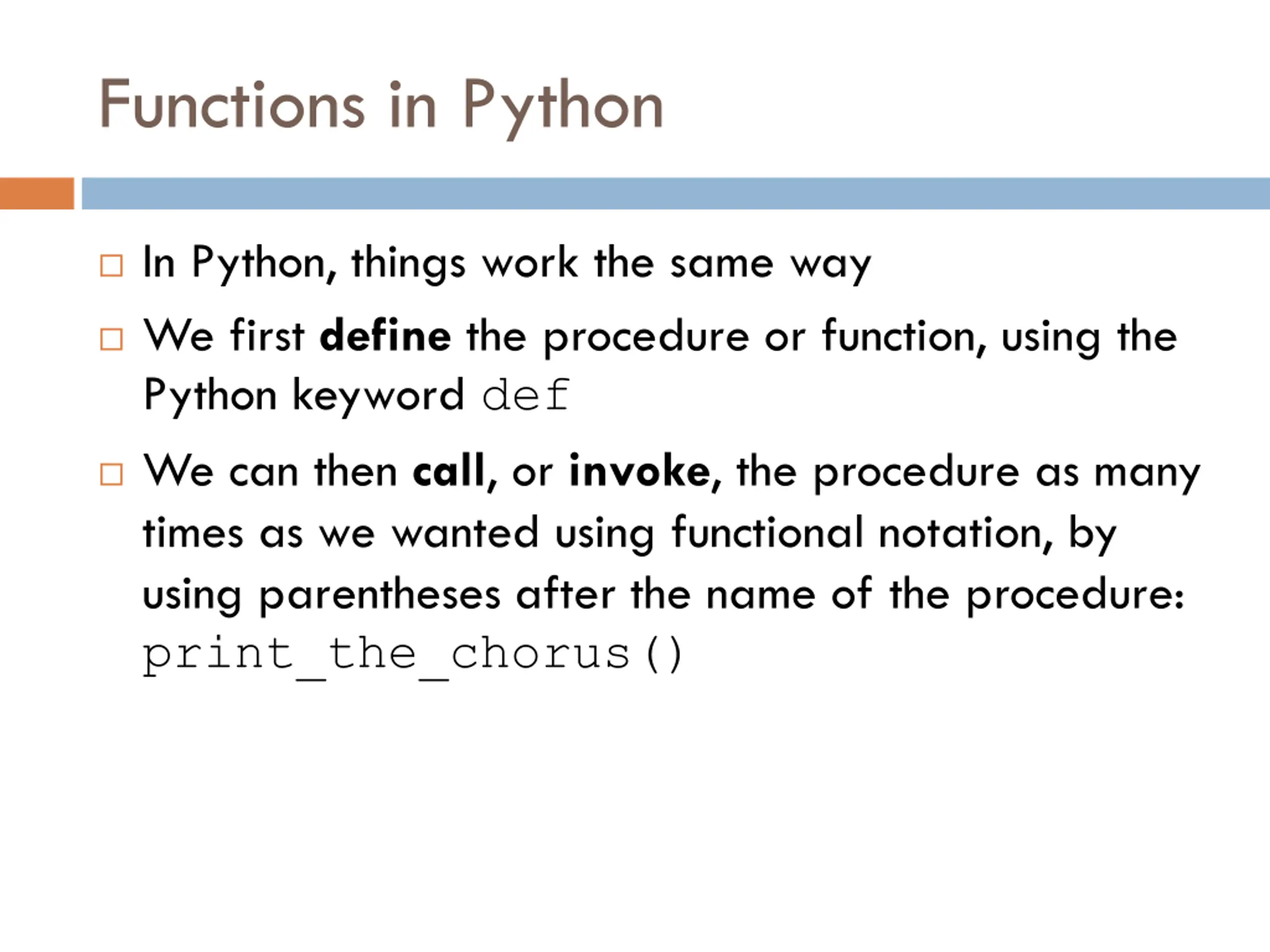 Functions in Python In Python, things work the same way We first define the procedure or function, using the Python keyword def We can then call, or invoke, the procedure as many times as we wanted using functional notation, by using parentheses after the name of the procedure: print_the_chorus()