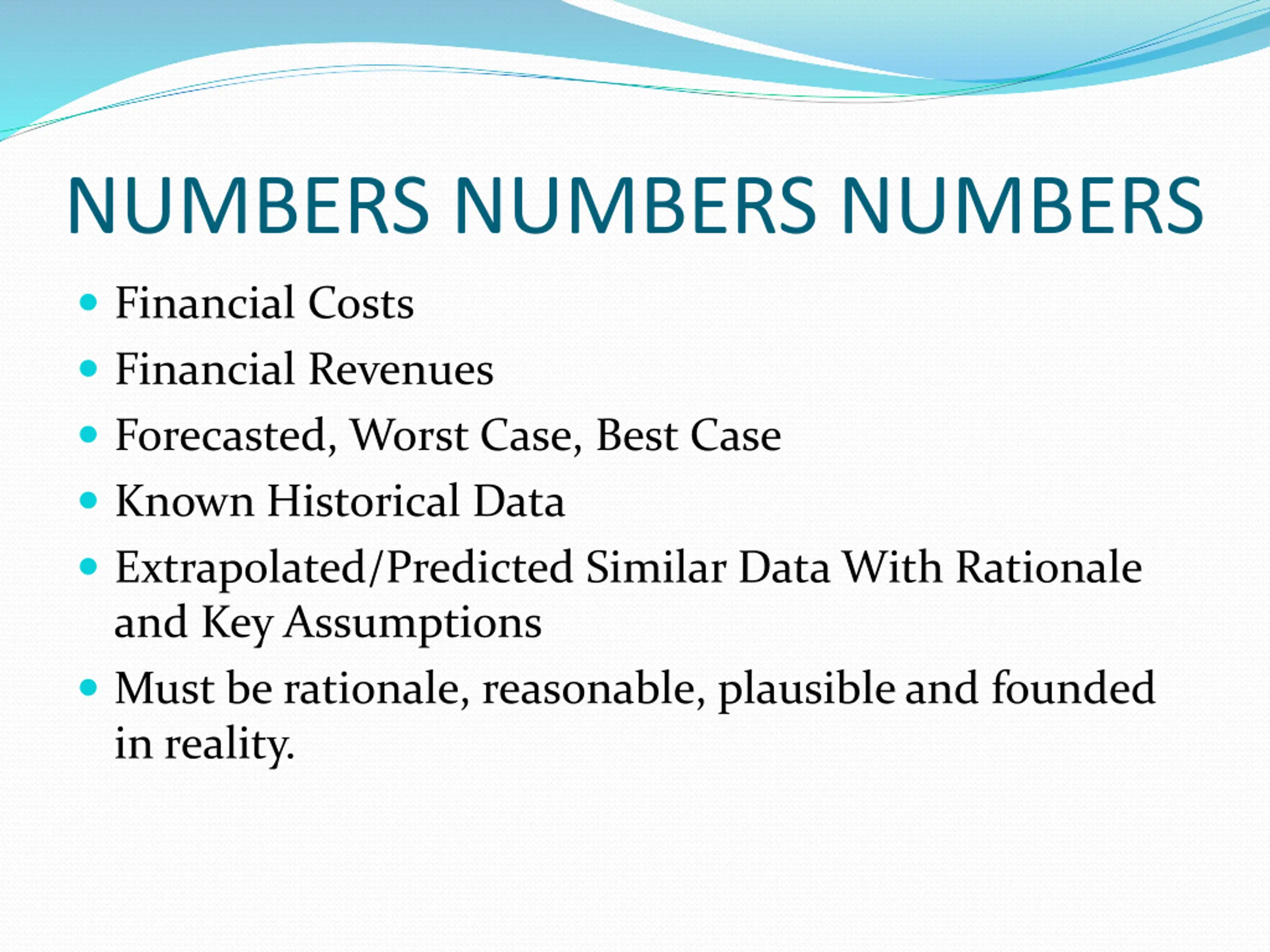 NUMBERS NUMBERS NUMBERS Financial Costs Financial Revenues Forecasted, Worst Case, Best Case Known Historical Data Extrapolated/Predicted Similar Data With Rationale and Key Assumptions Must be rationale, reasonable, plausible and founded in reality.