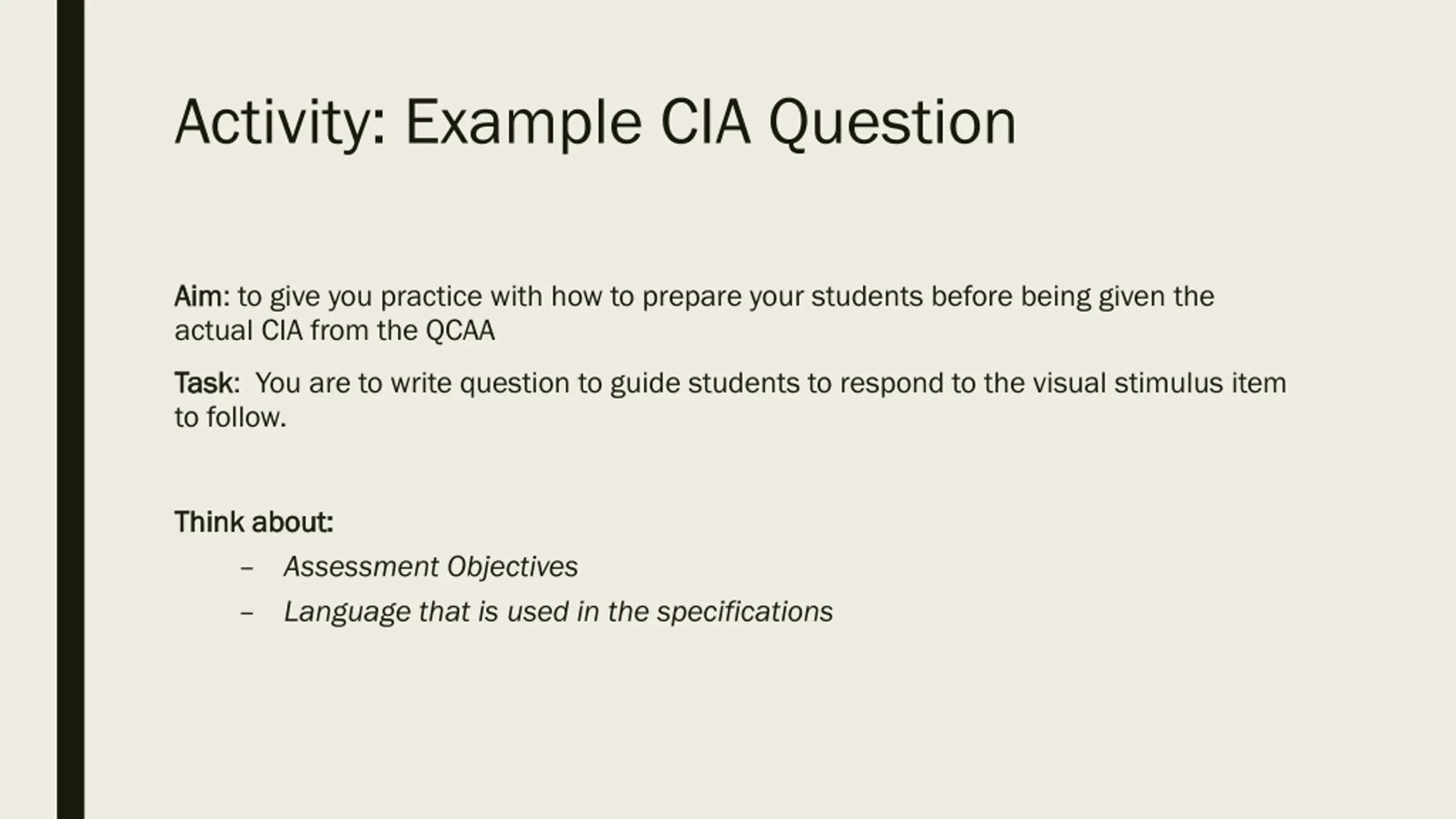 Activity: Example CIA Question Aim Aim: to give you practice with how to prepare your students before being given the actual CIA from the QCAA Task Task: You are to write question to guide students to respond to the visual stimulus item to follow. Think about: Think about: Assessment Objectives Language that is used in the specifications