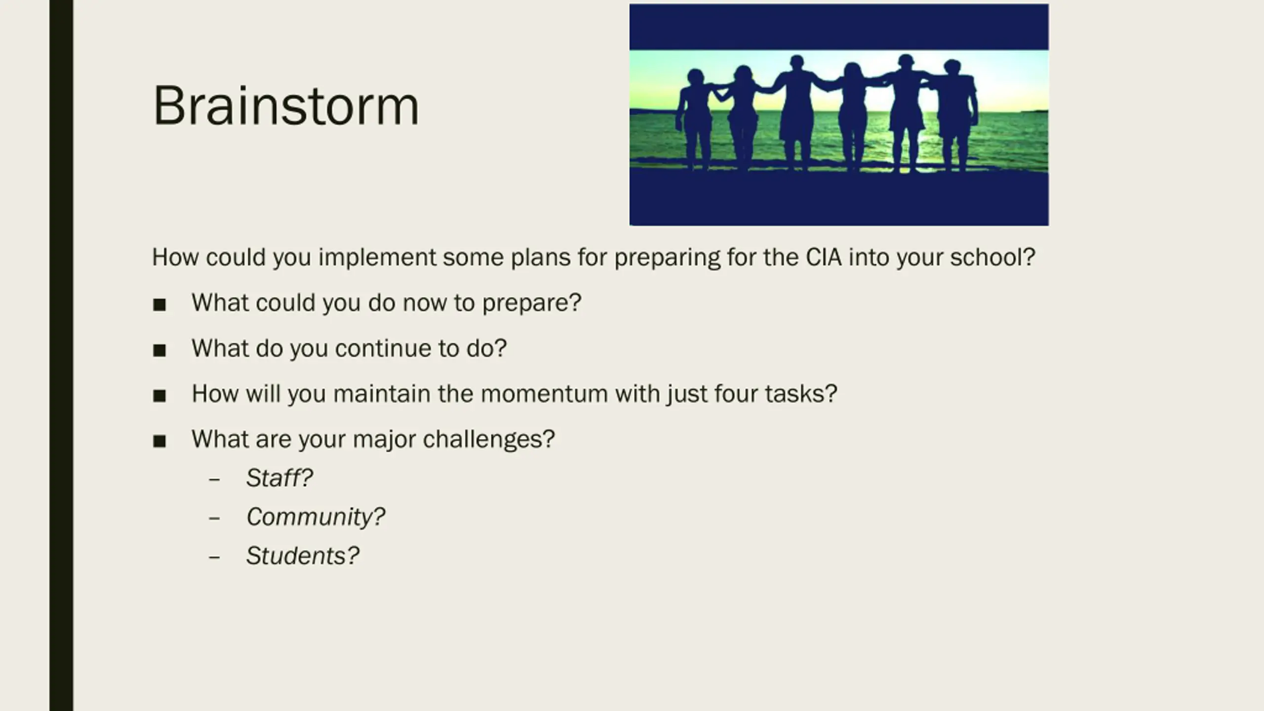 Brainstorm How could you implement some plans for preparing for the CIA into your school? What could you do now to prepare? What do you continue to do? How will you maintain the momentum with just four tasks? What are your major challenges? Staff? Community? Students?