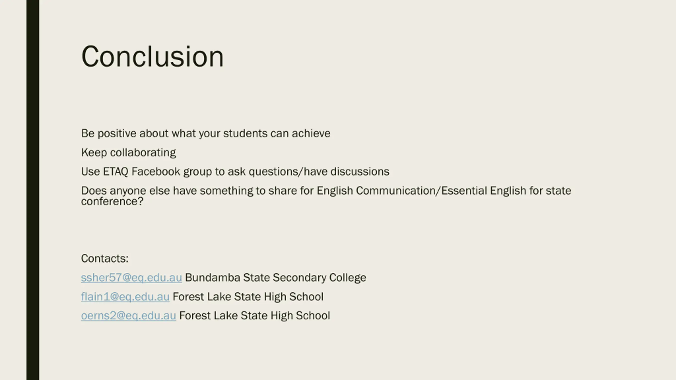 Conclusion Be positive about what your students can achieve Keep collaborating Use ETAQ Facebook group to ask questions/have discussions Does anyone else have something to share for English Communication/Essential English for state conference? Contacts: ssher57@eq.edu.au Bundamba State Secondary College flain1@eq.edu.au Forest Lake State High School oerns2@eq.edu.au Forest Lake State High School