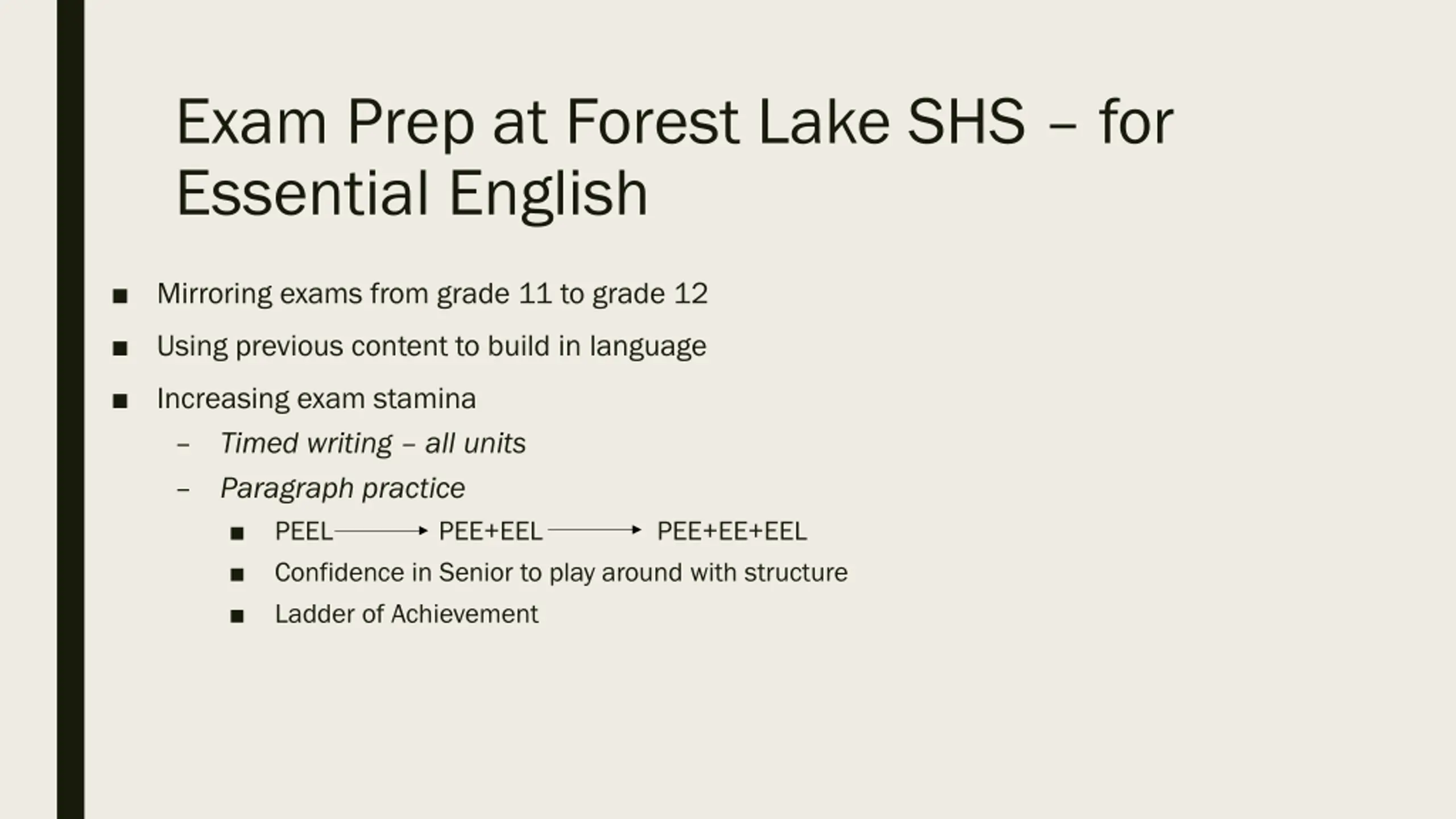 Exam Prep at Forest Lake SHS for Essential English Mirroring exams from grade 11 to grade 12 Using previous content to build in language Increasing exam stamina Timed writing all units Paragraph practice PEEL Confidence in Senior to play around with structure Ladder of Achievement PEE+EEL PEE+EE+EEL