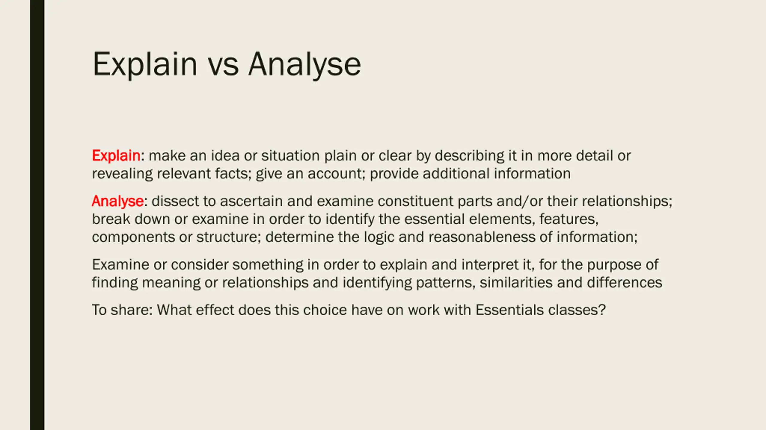 Explain vs Analyse Explain Explain: make an idea or situation plain or clear by describing it in more detail or revealing relevant facts; give an account; provide additional information Analyse Analyse: dissect to ascertain and examine constituent parts and/or their relationships; break down or examine in order to identify the essential elements, features, components or structure; determine the logic and reasonableness of information; Examine or consider something in order to explain and interpret it, for the purpose of finding meaning or relationships and identifying patterns, similarities and differences To share: What effect does this choice have on work with Essentials classes?