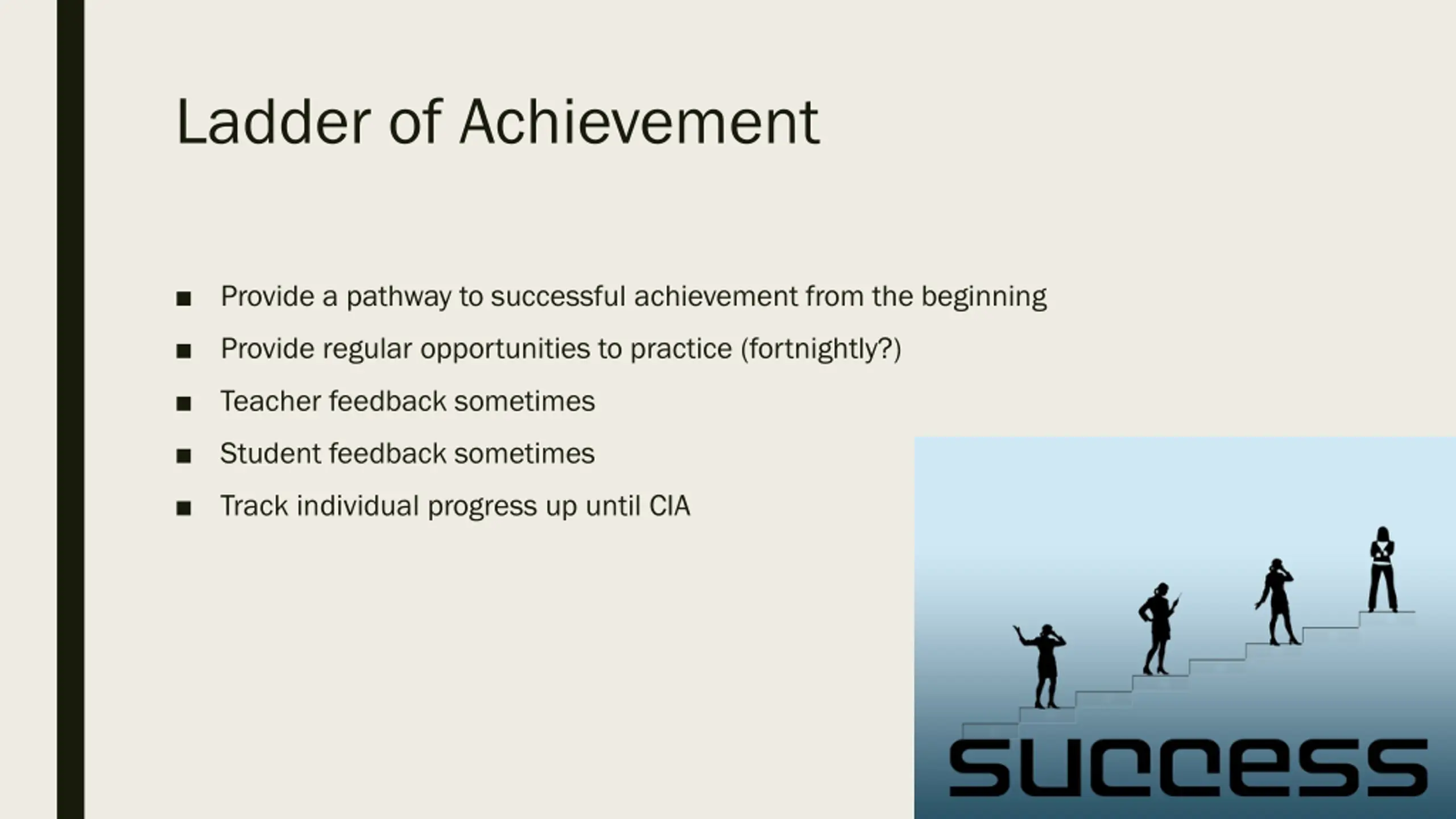 Ladder of Achievement Provide a pathway to successful achievement from the beginning Provide regular opportunities to practice (fortnightly?) Teacher feedback sometimes Student feedback sometimes Track individual progress up until CIA