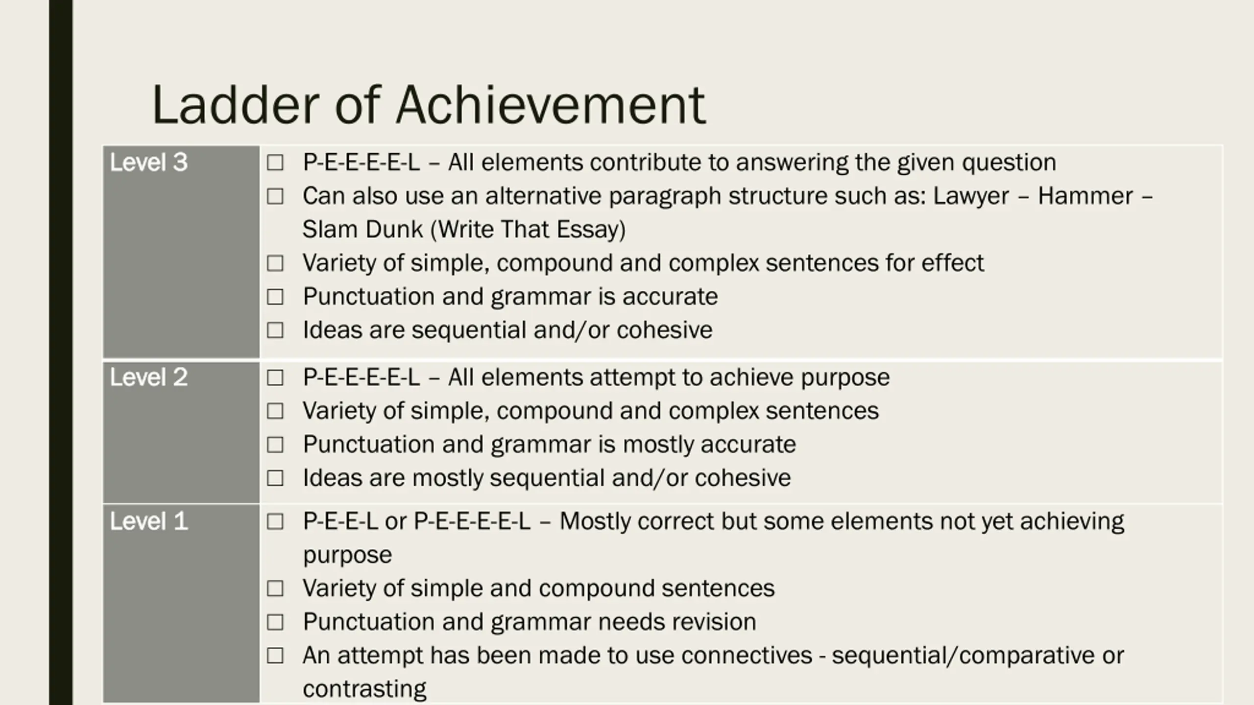 Ladder of Achievement Level 3 Level 3 P-E-E-E-E-L All elements contribute to answering the given question Can also use an alternative paragraph structure such as: Lawyer Hammer Slam Dunk (Write That Essay) Variety of simple, compound and complex sentences for effect Punctuation and grammar is accurate Ideas are sequential and/or cohesive Level 2 Level 2 P-E-E-E-E-L All elements attempt to achieve purpose Variety of simple, compound and complex sentences Punctuation and grammar is mostly accurate Ideas are mostly sequential and/or cohesive P-E-E-L or P-E-E-E-E-L Mostly correct but some elements not yet achieving purpose Variety of simple and compound sentences Punctuation and grammar needs revision An attempt has been made to use connectives - sequential/comparative or contrasting Level 1 Level 1