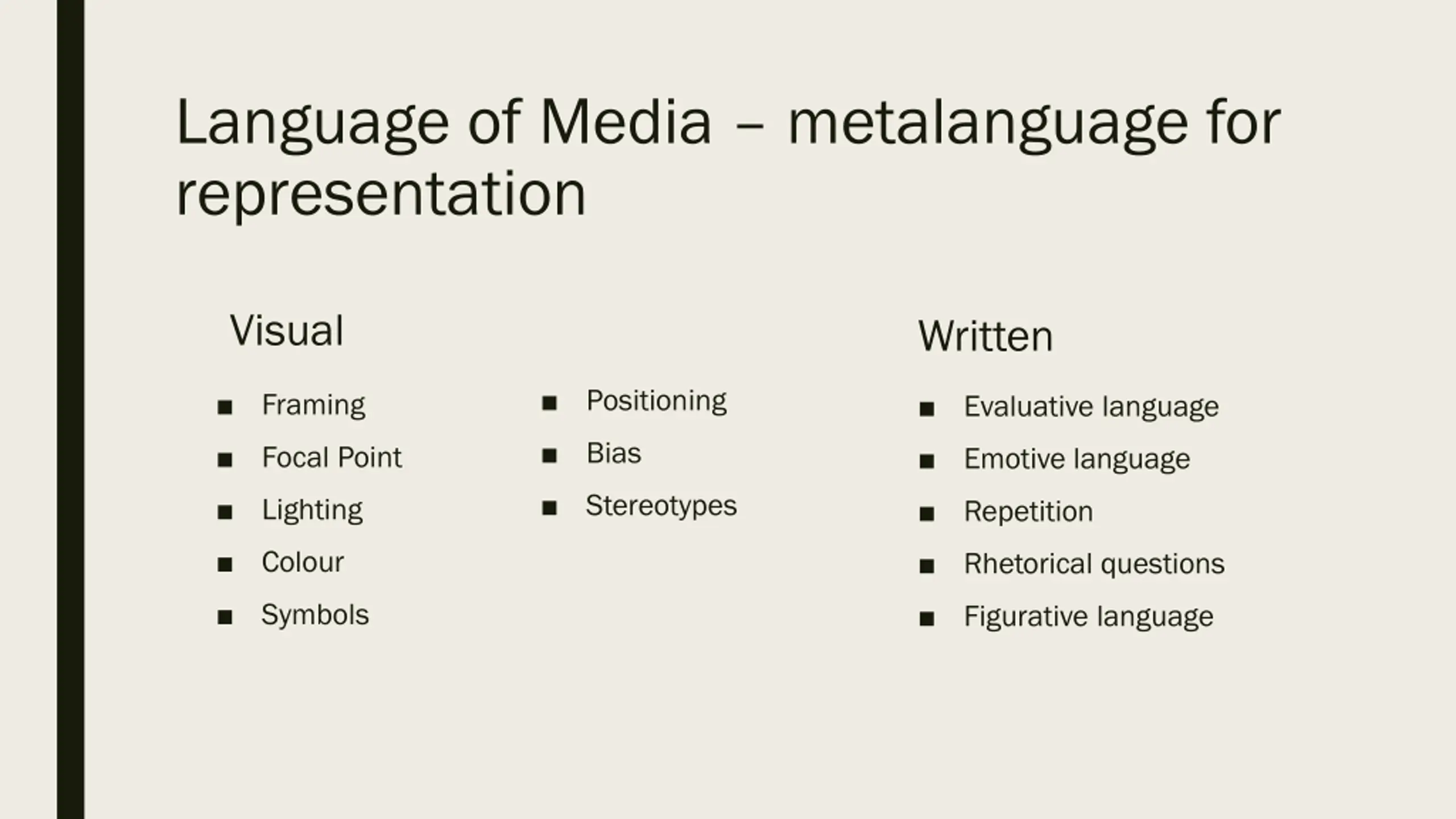 Language of Media metalanguage for representation Visual Written Positioning Framing Evaluative language Bias Focal Point Emotive language Stereotypes Lighting Repetition Colour Rhetorical questions Symbols Figurative language
