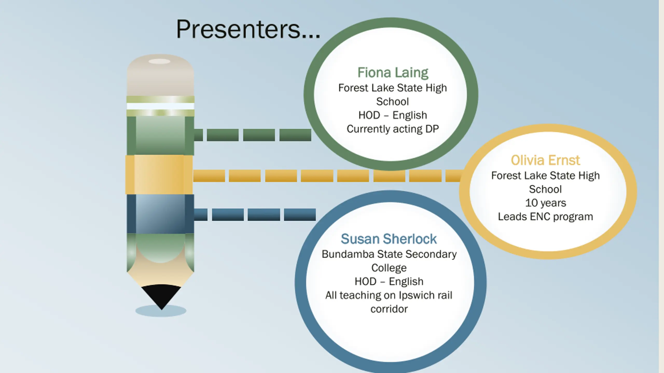 Presenters Fiona Laing Fiona Laing Forest Lake State High School HOD English Currently acting DP Olivia Ernst Olivia Ernst Forest Lake State High School 10 years Leads ENC program Susan Sherlock Susan Sherlock Bundamba State Secondary College HOD English All teaching on Ipswich rail corridor