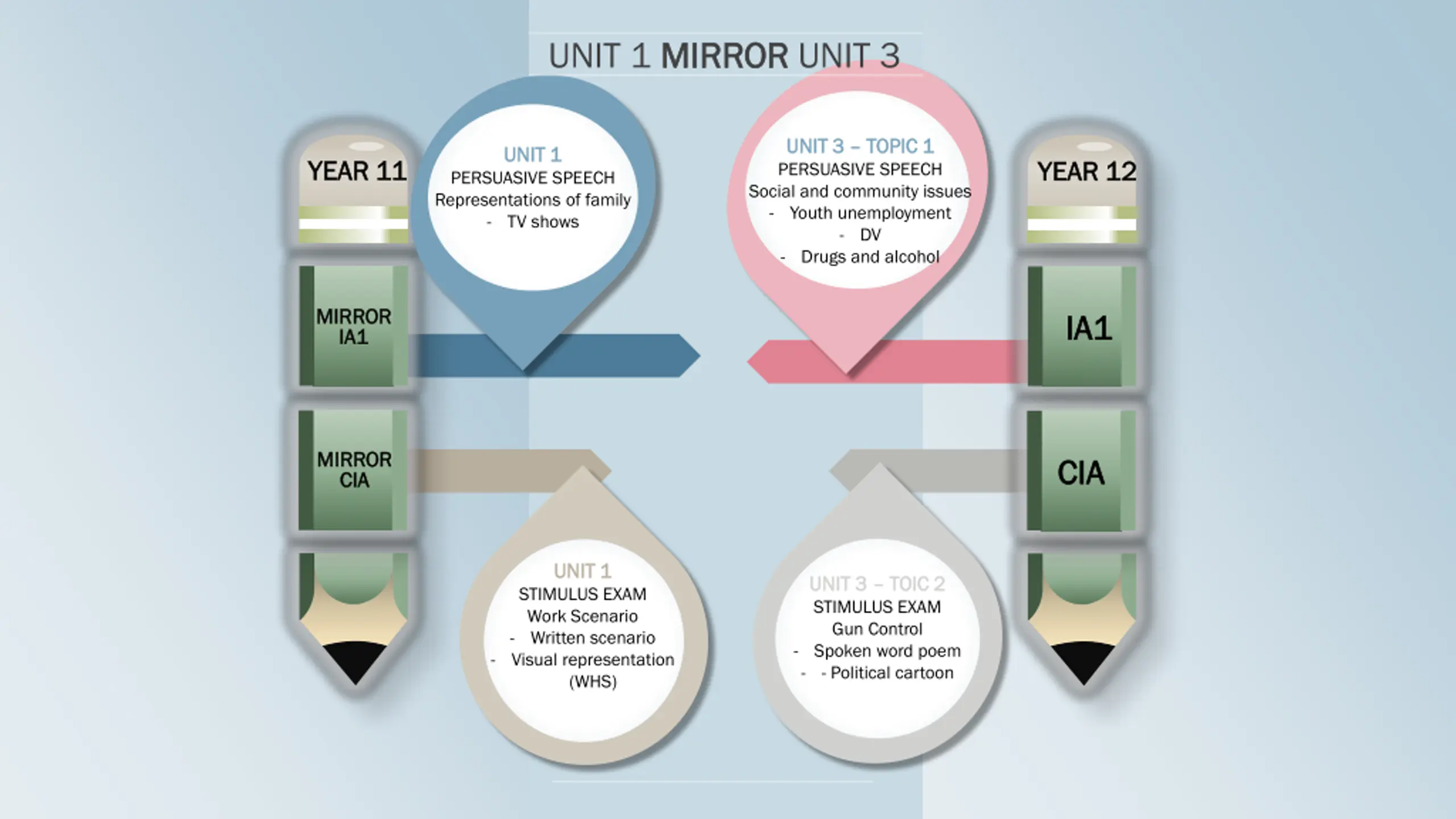 UNIT 1 MIRROR MIRROR UNIT 3 UNIT 3 UNIT 3 TOPIC 1 PERSUASIVE SPEECH Social and community issues - Youth unemployment - DV - Drugs and alcohol TOPIC 1 UNIT 1 UNIT 1 YEAR 11 YEAR 11 YEAR 12 YEAR 12 PERSUASIVE SPEECH Representations of family - TV shows MIRROR MIRROR IA1 IA1 IA1 IA1 MIRROR MIRROR CIA CIA CIA CIA UNIT 1 UNIT 1 UNIT 3 UNIT 3 TOIC 2 STIMULUS EXAM Gun Control - Spoken word poem - - Political cartoon TOIC 2 STIMULUS EXAM Work Scenario - Written scenario - Visual representation (WHS)