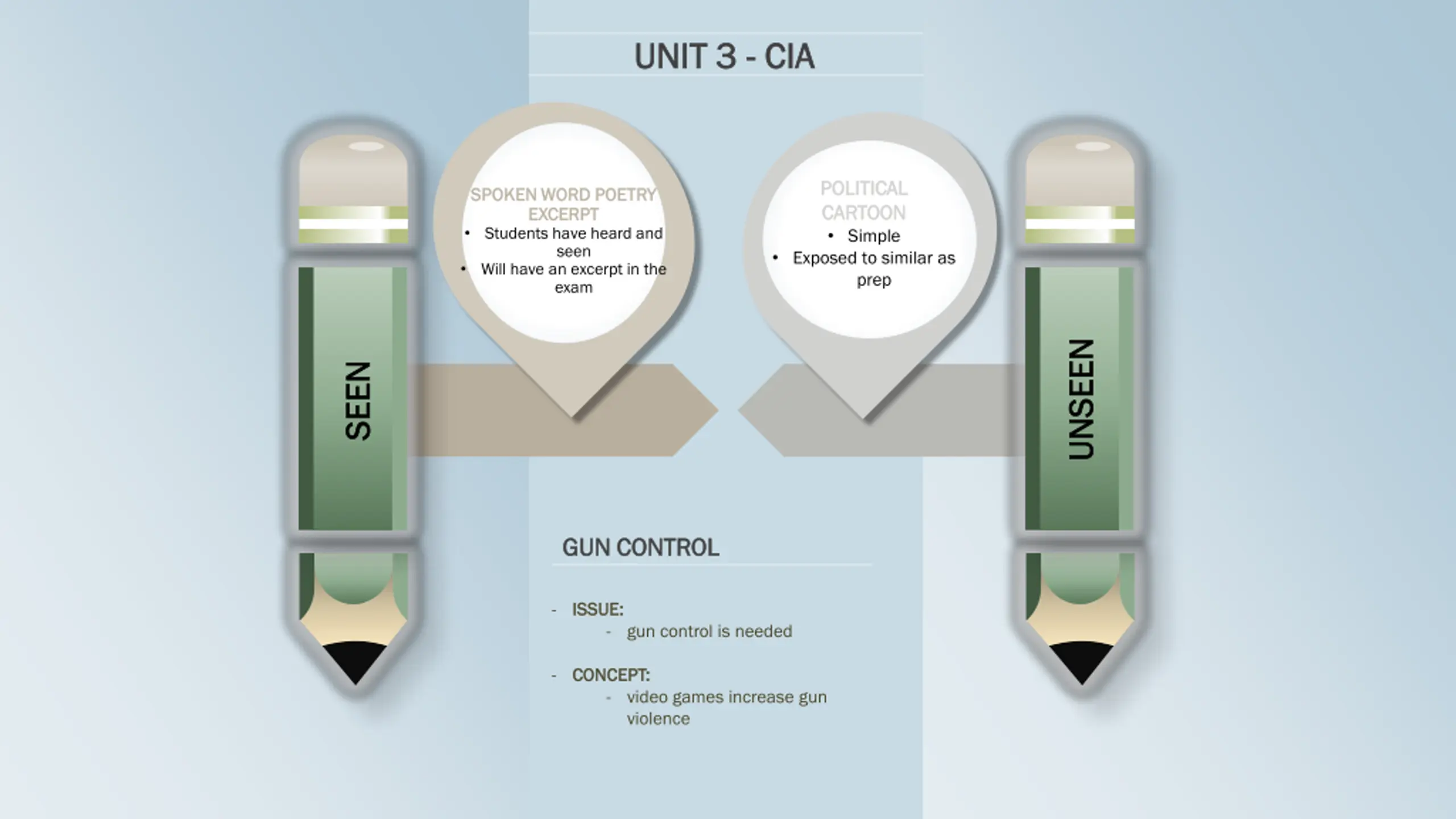 UNIT 3 UNIT 3 - - CIA CIA POLITICAL POLITICAL CARTOON CARTOON Simple SPOKEN WORD POETRY SPOKEN WORD POETRY EXCERPT EXCERPT Students have heard and seen Will have an excerpt in the exam Exposed to similar as prep UNSEEN UNSEEN SEEN SEEN GUN CONTROL GUN CONTROL - ISSUE ISSUE: : - gun control is needed - CONCEPT: CONCEPT: - video games increase gun violence