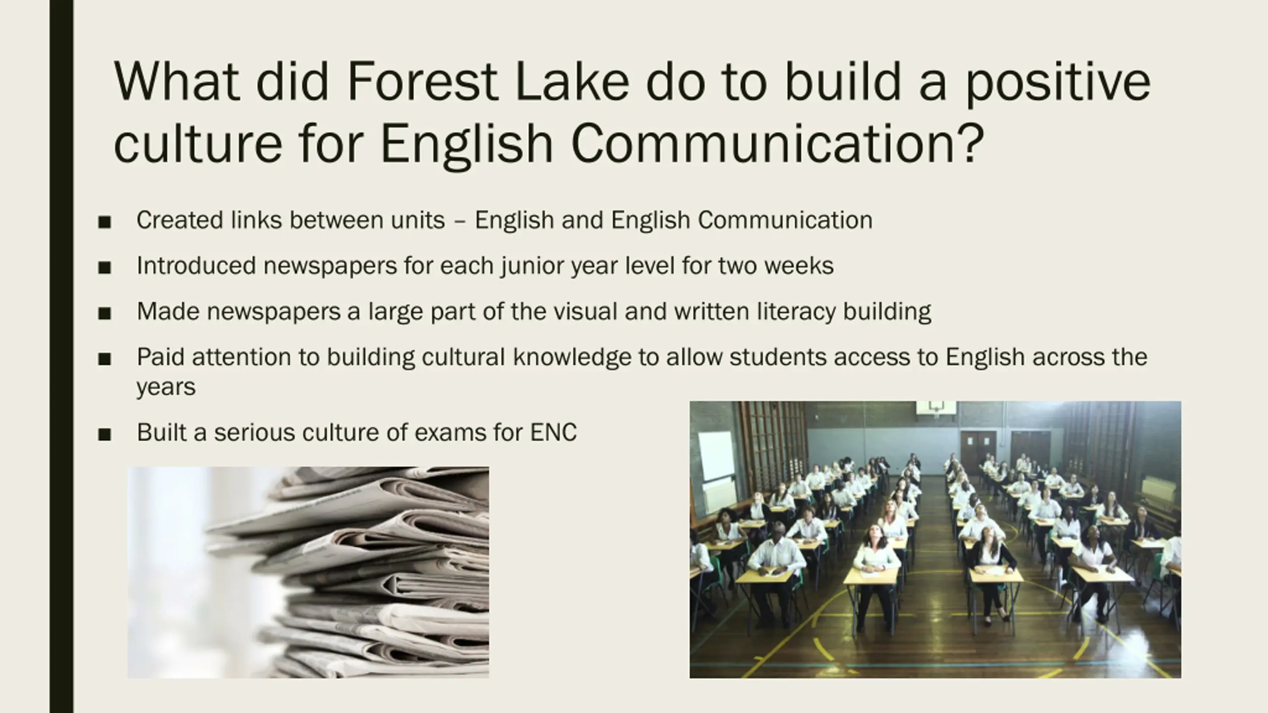 What did Forest Lake do to build a positive culture for English Communication? Created links between units English and English Communication Introduced newspapers for each junior year level for two weeks Made newspapers a large part of the visual and written literacy building Paid attention to building cultural knowledge to allow students access to English across the years Built a serious culture of exams for ENC