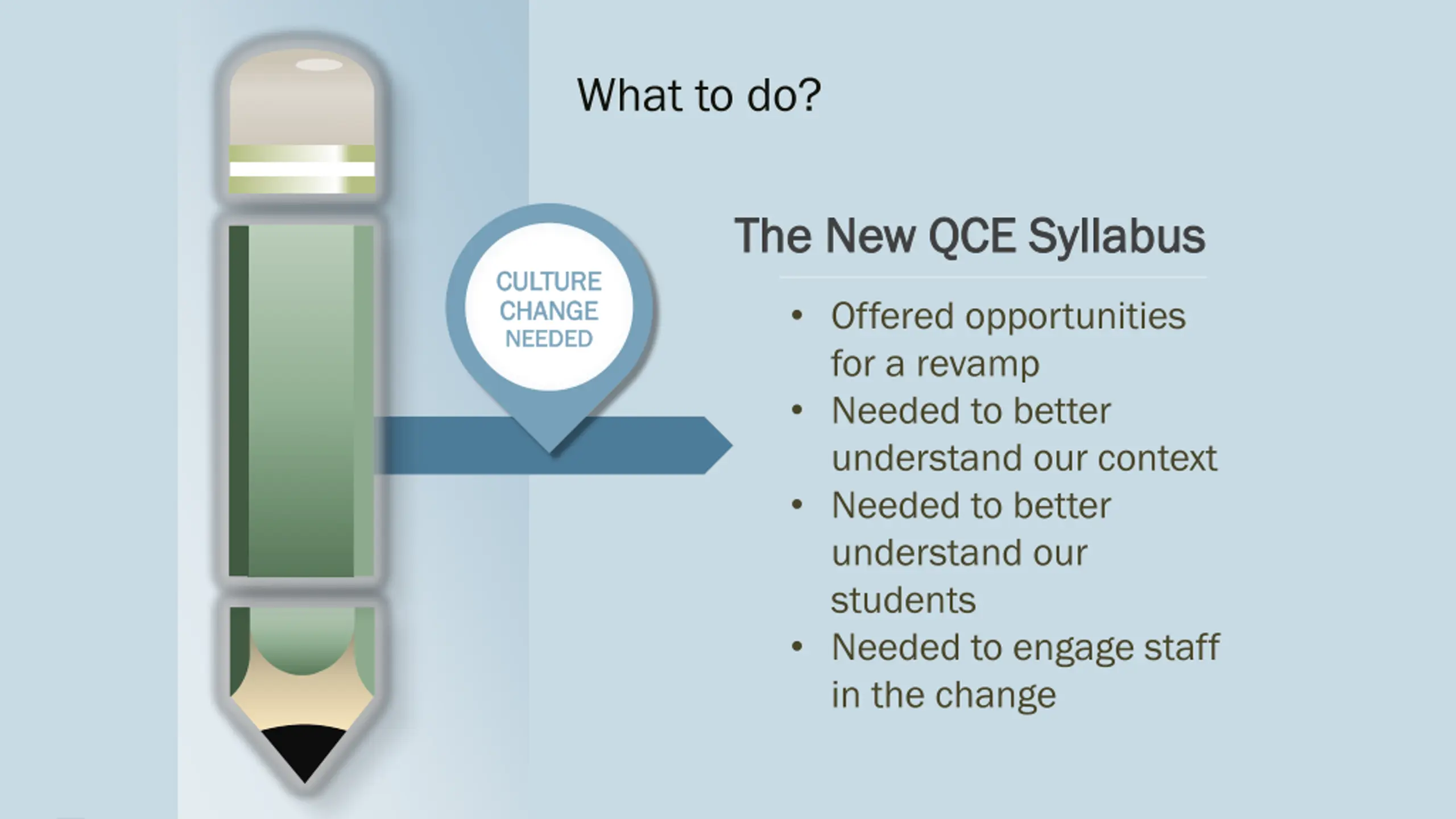 What to do? The New QCE Syllabus The New QCE Syllabus CULTURE CULTURE CHANGE CHANGE NEEDED NEEDED Offered opportunities for a revamp Needed to better understand our context Needed to better understand our students Needed to engage staff in the change