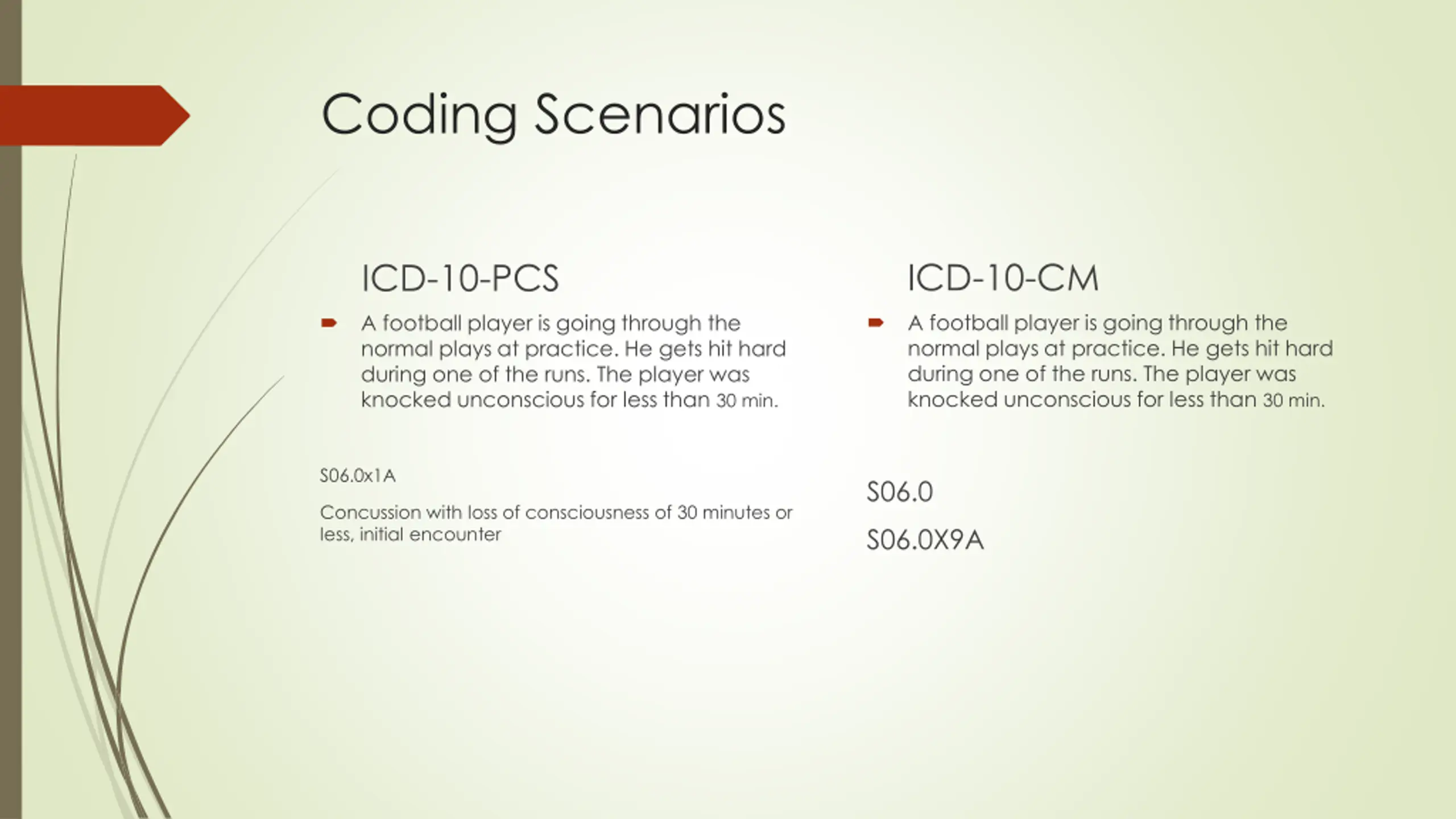 Coding Scenarios ICD-10-CM A football player is going through the normal plays at practice. He gets hit hard during one of the runs. The player was knocked unconscious for less than 30 min. ICD-10-PCS A football player is going through the normal plays at practice. He gets hit hard during one of the runs. The player was knocked unconscious for less than 30 min. S06.0x1A S06.0 Concussion with loss of consciousness of 30 minutes or less, initial encounter S06.0X9A