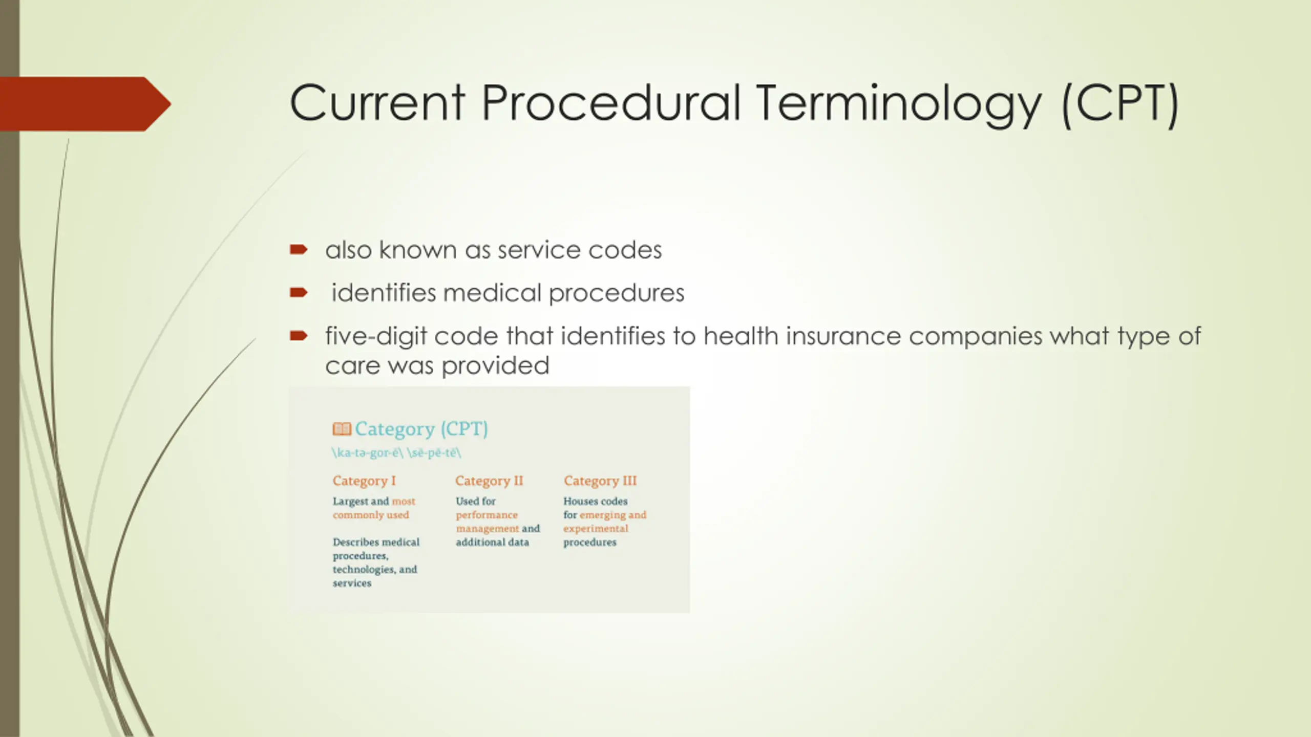 Current Procedural Terminology (CPT) also known as service codes identifies medical procedures five-digit code that identifies to health insurance companies what type of care was provided