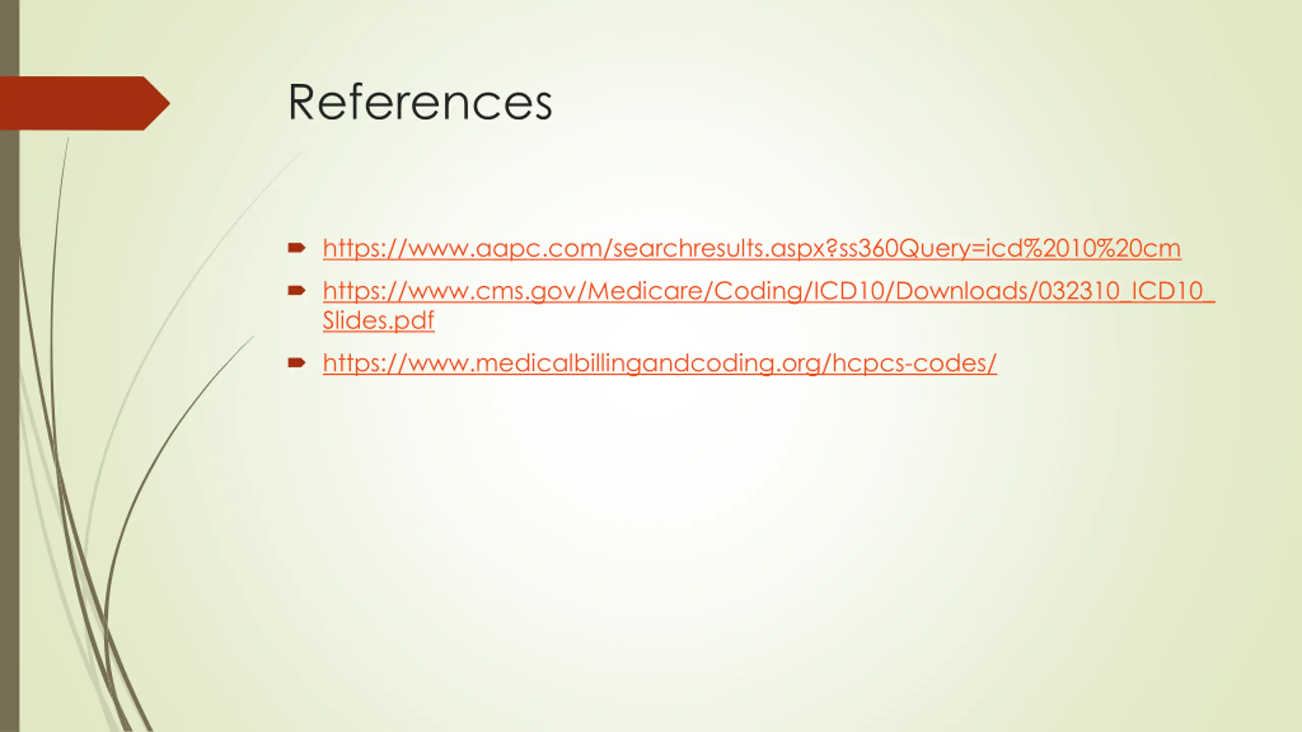 References https://www.aapc.com/searchresults.aspx?ss360Query=icd%2010%20cm https://www.cms.gov/Medicare/Coding/ICD10/Downloads/032310_ICD10_ Slides.pdf https://www.medicalbillingandcoding.org/hcpcs-codes/