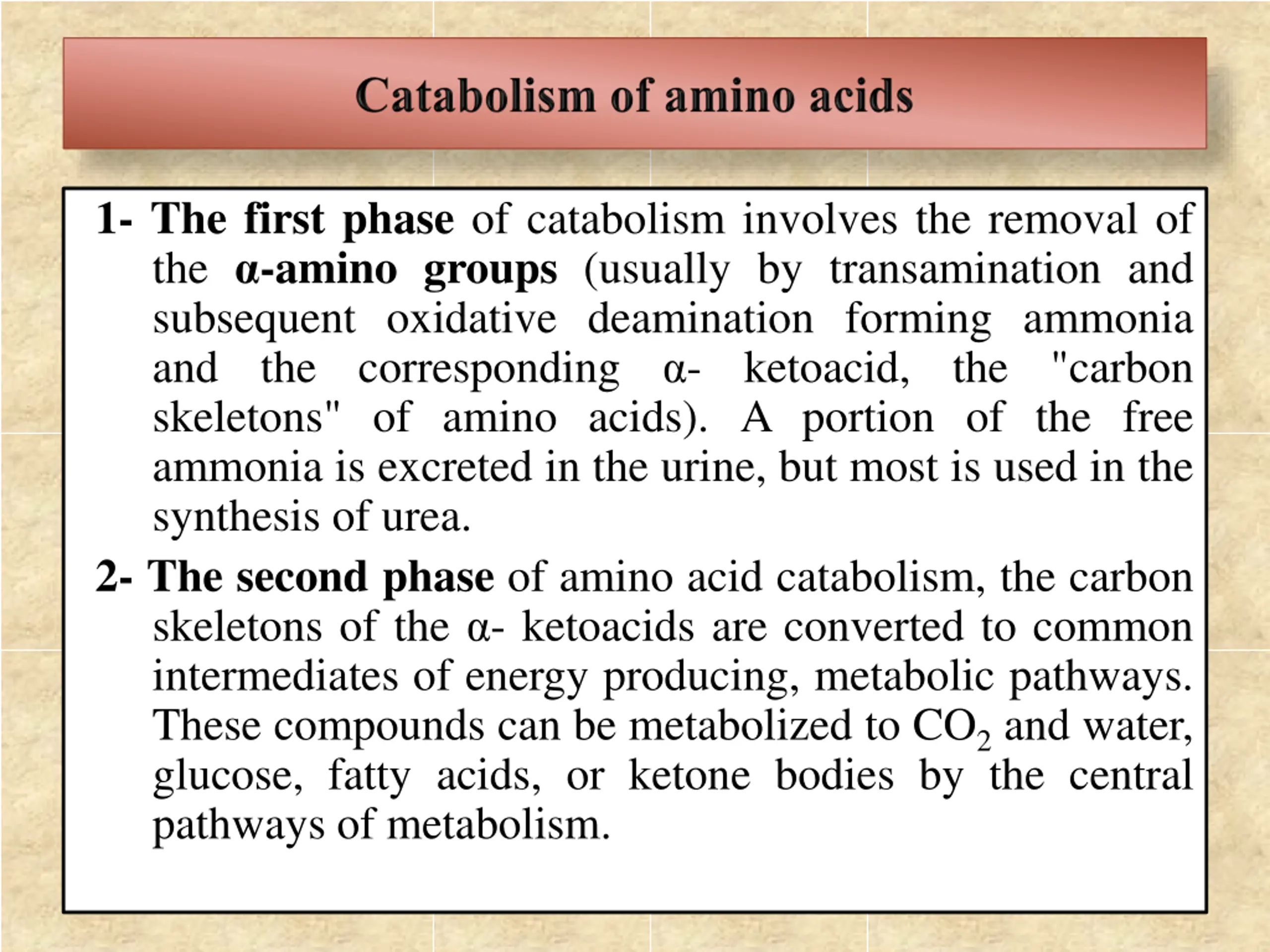 1- The first phase of catabolism involves the removal of the -amino groups (usually by transamination and subsequent oxidative deamination forming ammonia and the corresponding - ketoacid, the "carbon skeletons" of amino acids). A portion of the free ammonia is excreted in the urine, but most is used in the synthesis of urea. 2- The second phase of amino acid catabolism, the carbon skeletons of the - ketoacids are converted to common intermediates of energy producing, metabolic pathways. These compounds can be metabolized to CO2 and water, glucose, fatty acids, or ketone bodies by the central pathways of metabolism.