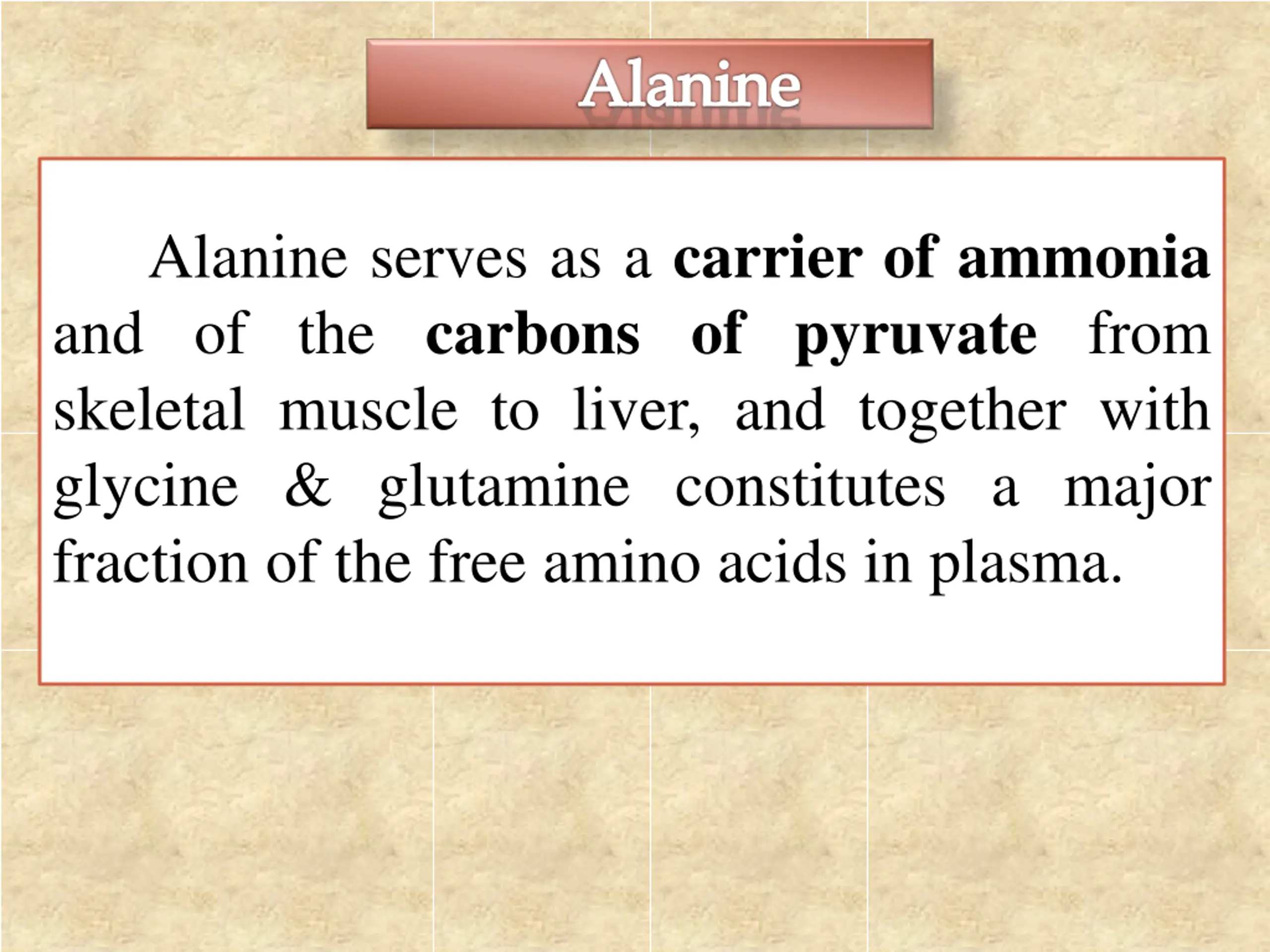 Alanine Alanine serves as a carrier of ammonia and of the carbons of pyruvate from skeletal muscle to liver, and together with glycine & glutamine constitutes a major fraction of the free amino acids in plasma.