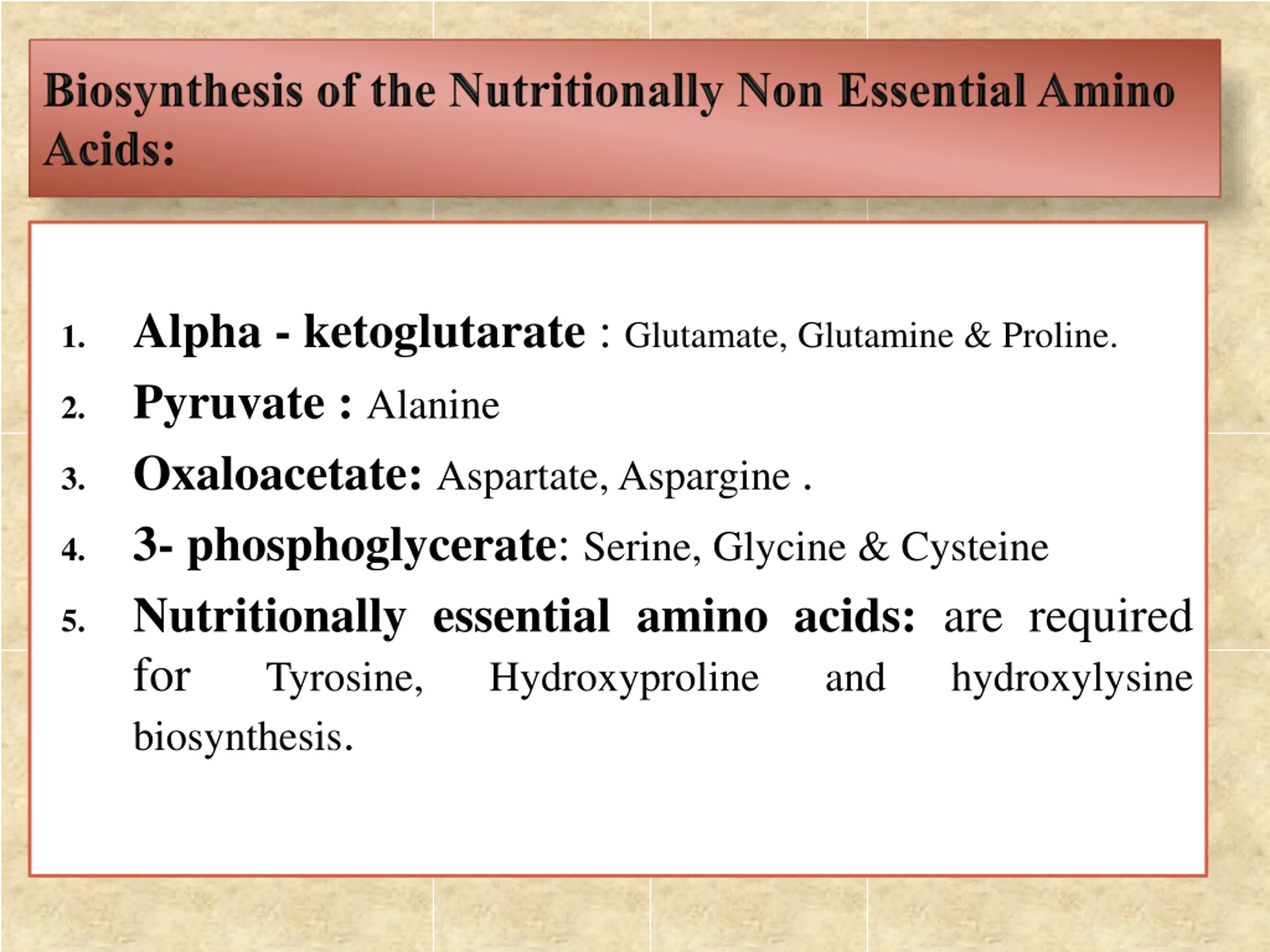 Alpha - ketoglutarate : Glutamate, Glutamine & Proline. Pyruvate :Alanine Oxaloacetate:Aspartate, Aspargine . 3- phosphoglycerate: Serine, Glycine & Cysteine Nutritionally essential amino acids: are required for Tyrosine, Hydroxyproline biosynthesis. 1. 2. 3. 4. 5. and hydroxylysine