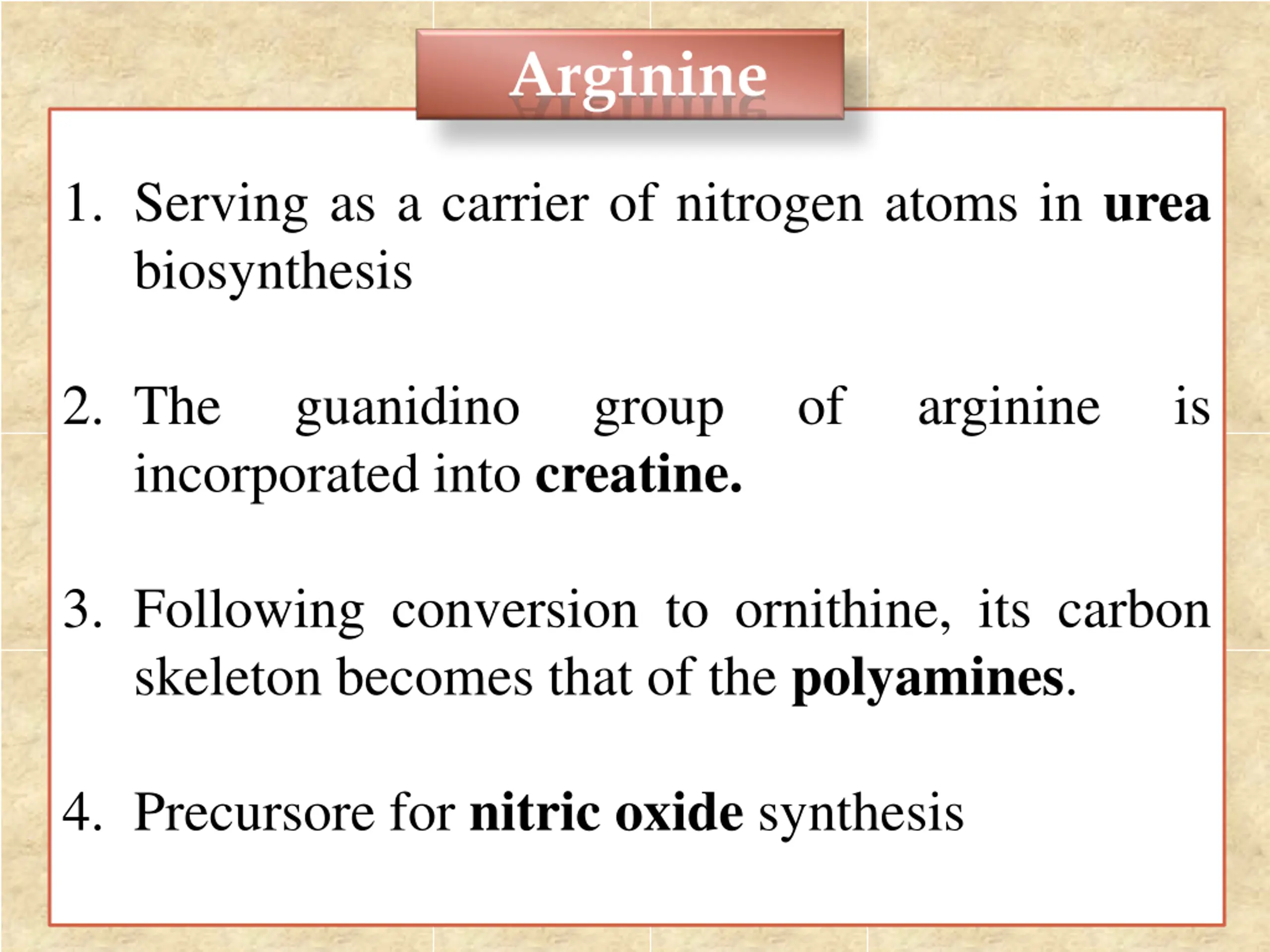 Arginine 1. Serving as a carrier of nitrogen atoms in urea biosynthesis 2. The incorporated into creatine. guanidino group of arginine is 3. Following conversion to ornithine, its carbon skeleton becomes that of the polyamines. 4. Precursore for nitric oxide synthesis