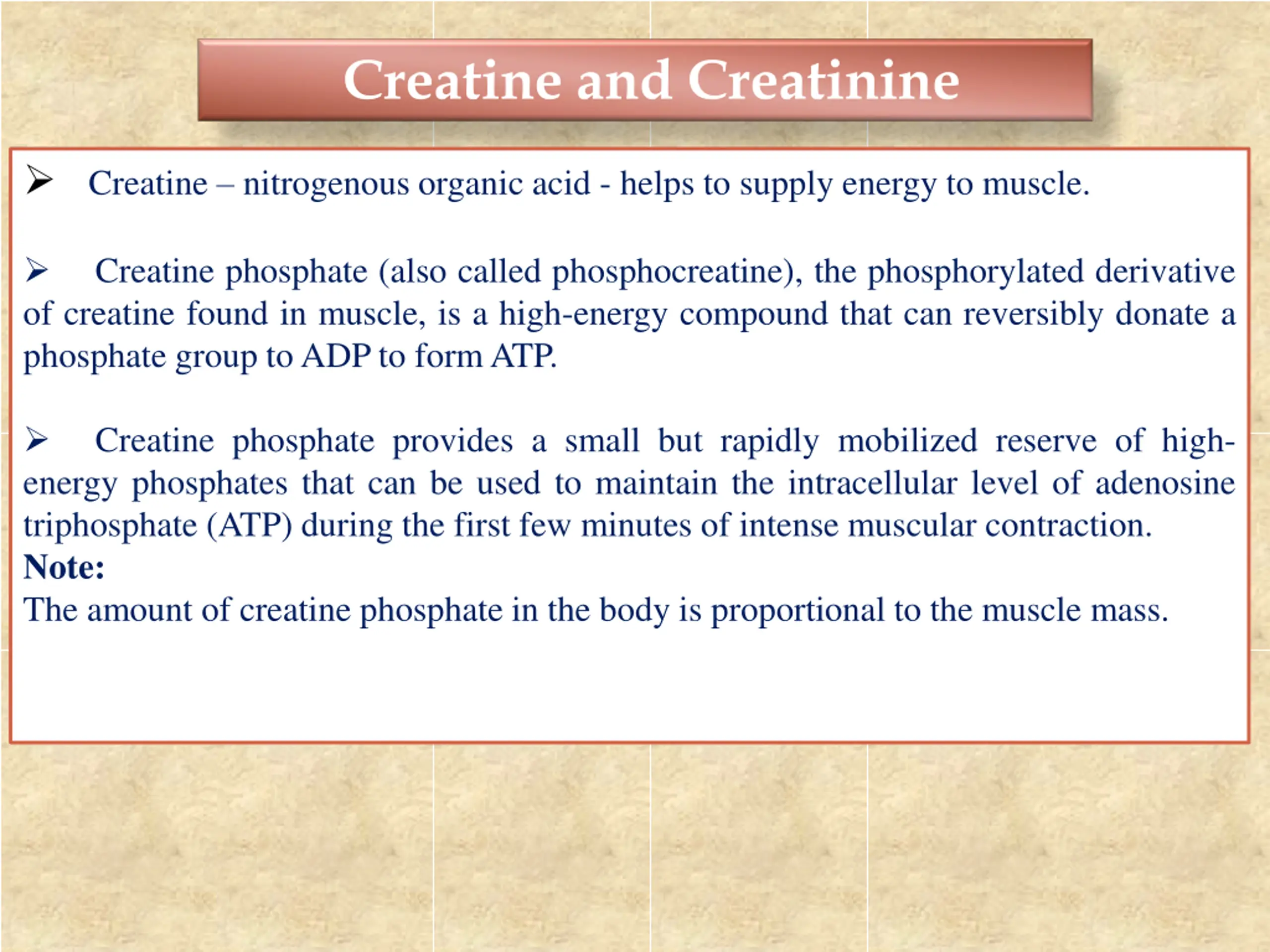 Creatine and Creatinine Creatine nitrogenous organic acid - helps to supply energy to muscle. Creatine phosphate (also called phosphocreatine), the phosphorylated derivative of creatine found in muscle, is a high-energy compound that can reversibly donate a phosphate group to ADP to form ATP. Creatine phosphate provides a small but rapidly mobilized reserve of high- energy phosphates that can be used to maintain the intracellular level of adenosine triphosphate (ATP) during the first few minutes of intense muscular contraction. Note: The amount of creatine phosphate in the body is proportional to the muscle mass.