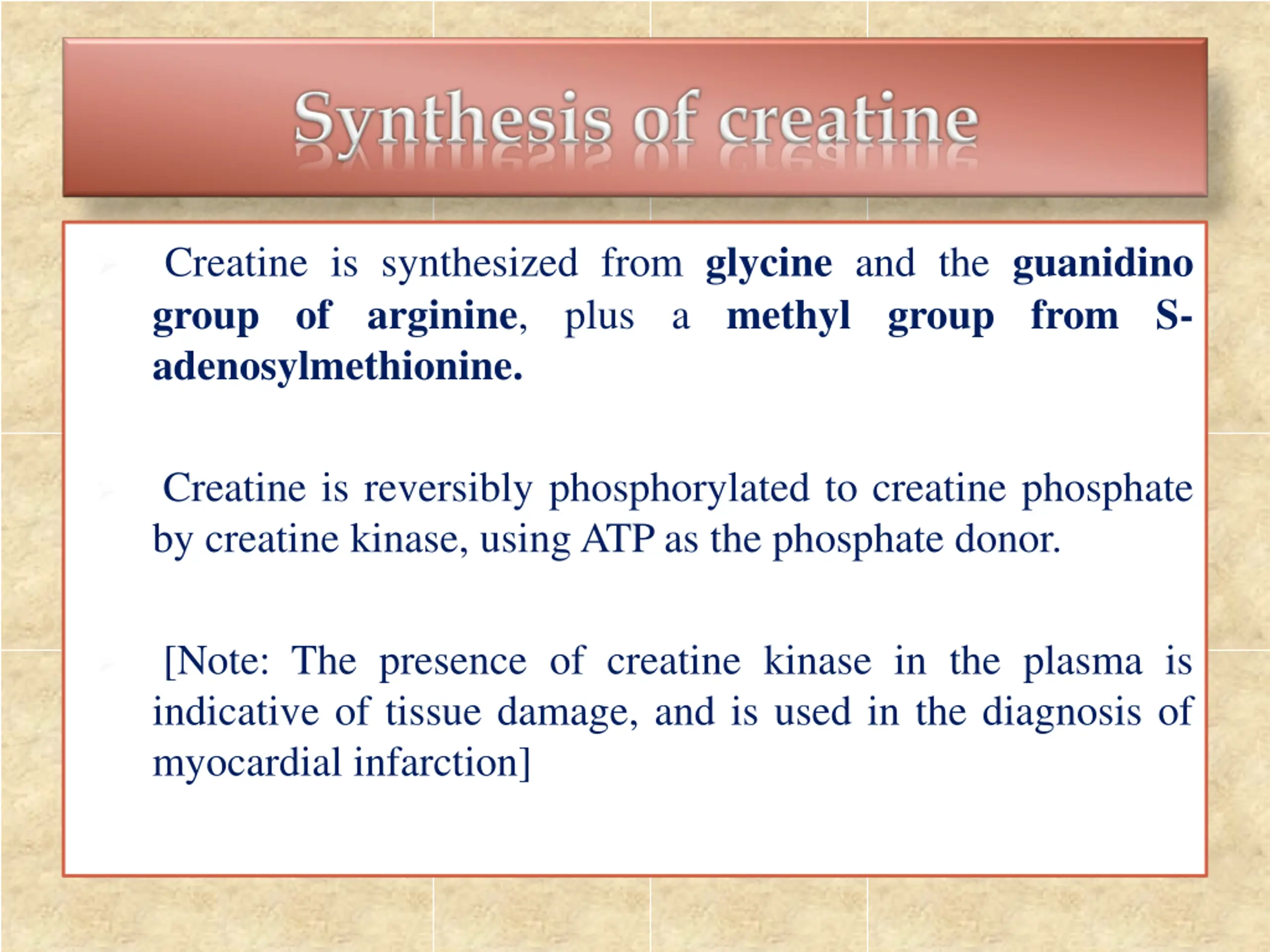 Creatine is synthesized from glycine and the guanidino group of arginine, plus a methyl group from S- adenosylmethionine. Creatine is reversibly phosphorylated to creatine phosphate by creatine kinase, using ATP as the phosphate donor. [Note: The presence of creatine kinase in the plasma is indicative of tissue damage, and is used in the diagnosis of myocardial infarction]