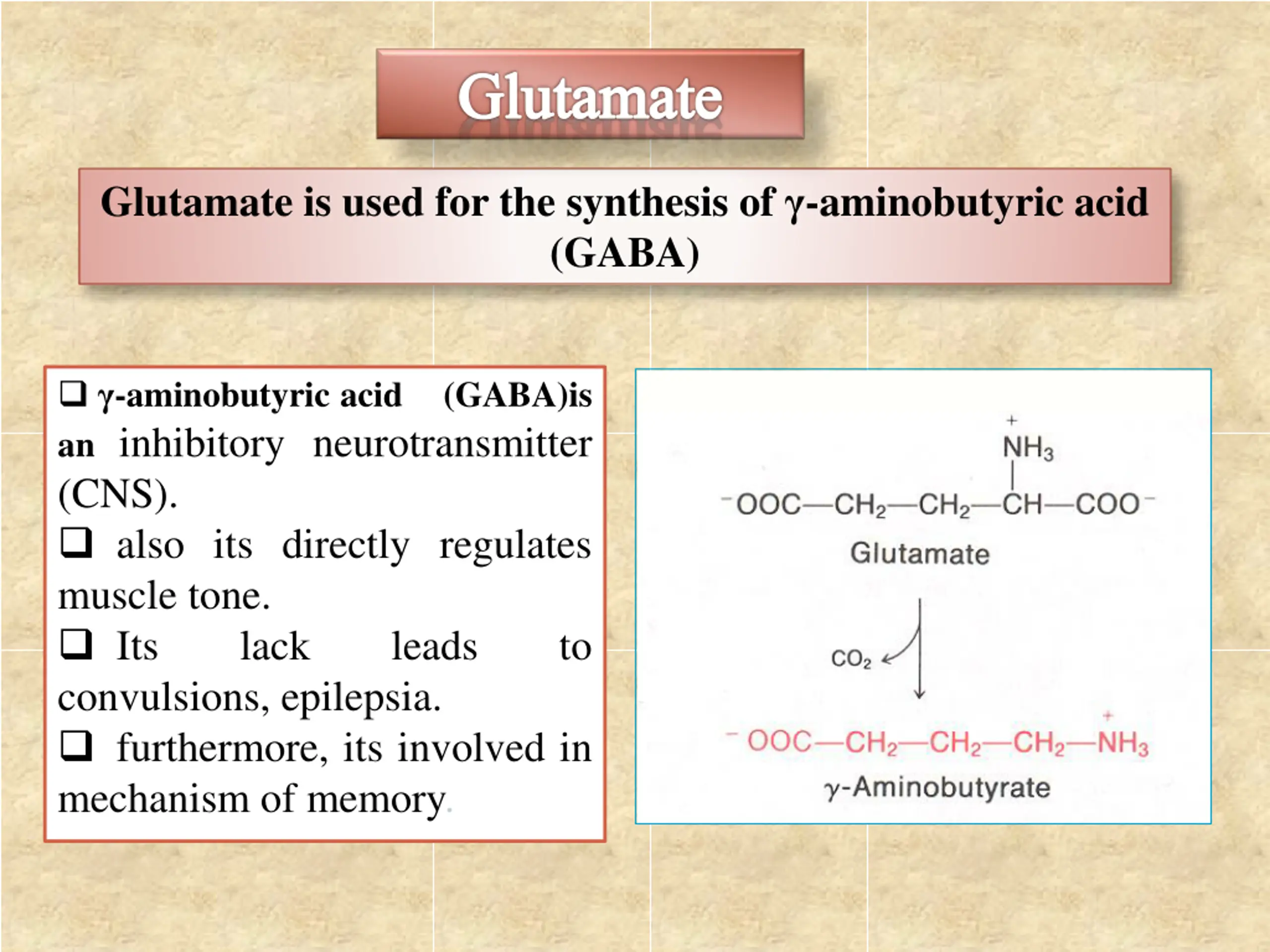 Glutamate Glutamate is used for the synthesis of -aminobutyric acid (GABA) -aminobutyric acid an inhibitory neurotransmitter (CNS). also its directly regulates muscle tone. Its lack convulsions, epilepsia. furthermore, its involved in mechanism of memory. (GABA)is leads to