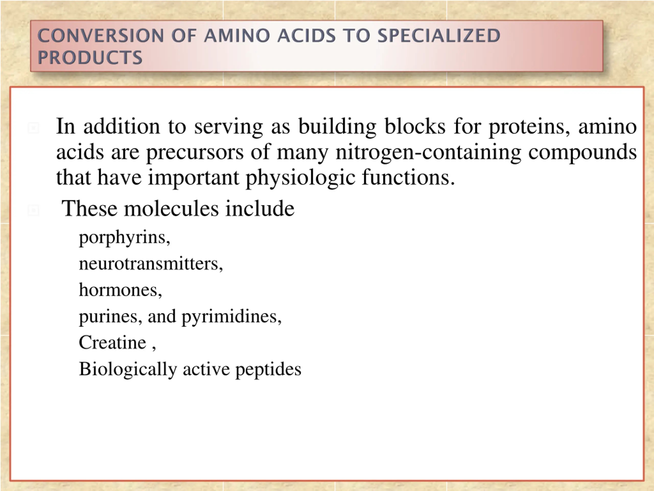 In addition to serving as building blocks for proteins, amino acids are precursors of many nitrogen-containing compounds that have important physiologic functions. These molecules include porphyrins, neurotransmitters, hormones, purines, and pyrimidines, Creatine , Biologically active peptides