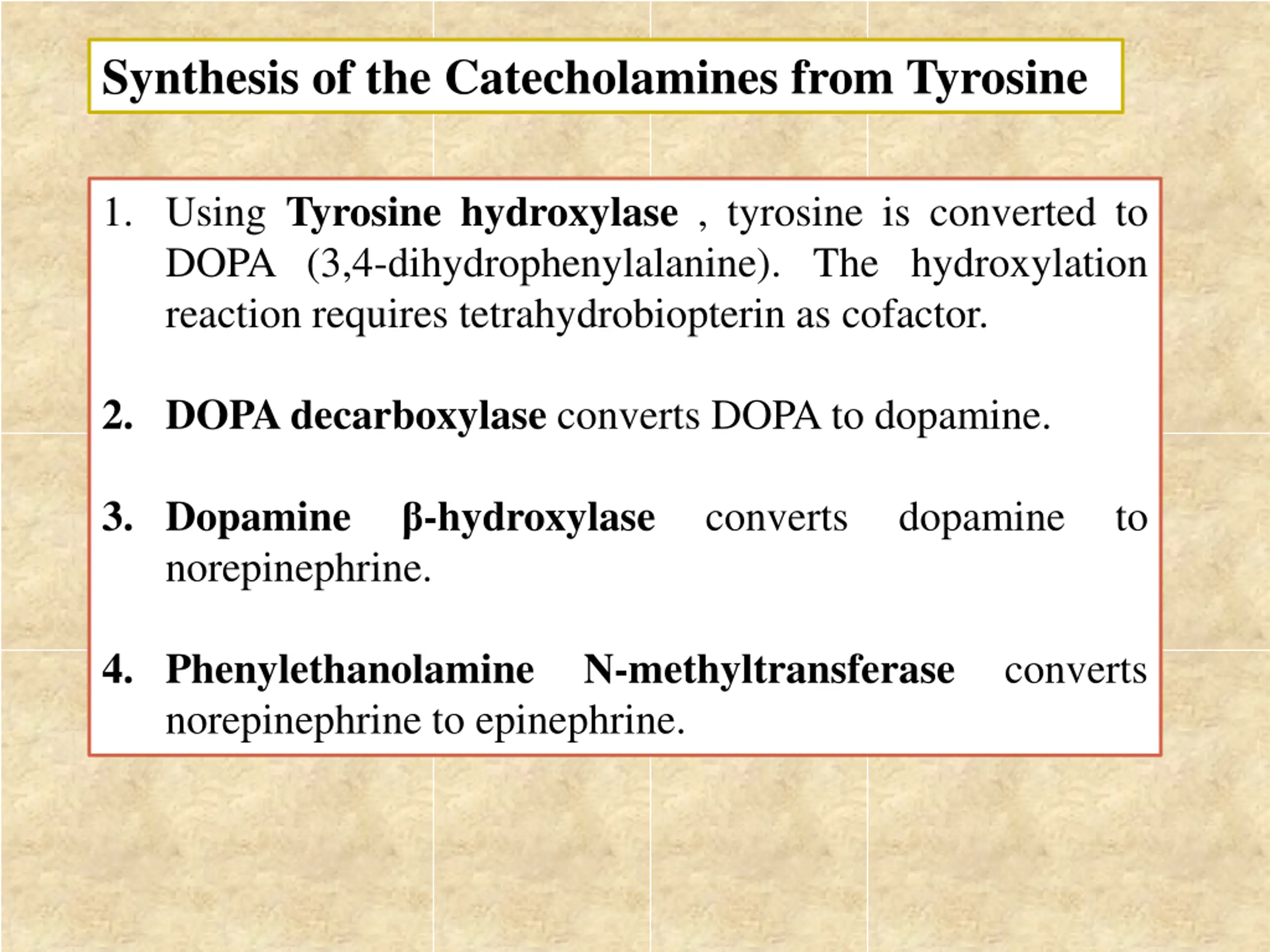 Synthesis of the Catecholamines from Tyrosine 1. Using Tyrosine hydroxylase , tyrosine is converted to DOPA (3,4-dihydrophenylalanine). The hydroxylation reaction requires tetrahydrobiopterin as cofactor. 2. DOPA decarboxylase converts DOPA to dopamine. 3. Dopamine norepinephrine. -hydroxylase converts dopamine to 4. Phenylethanolamine norepinephrine to epinephrine. N-methyltransferase converts