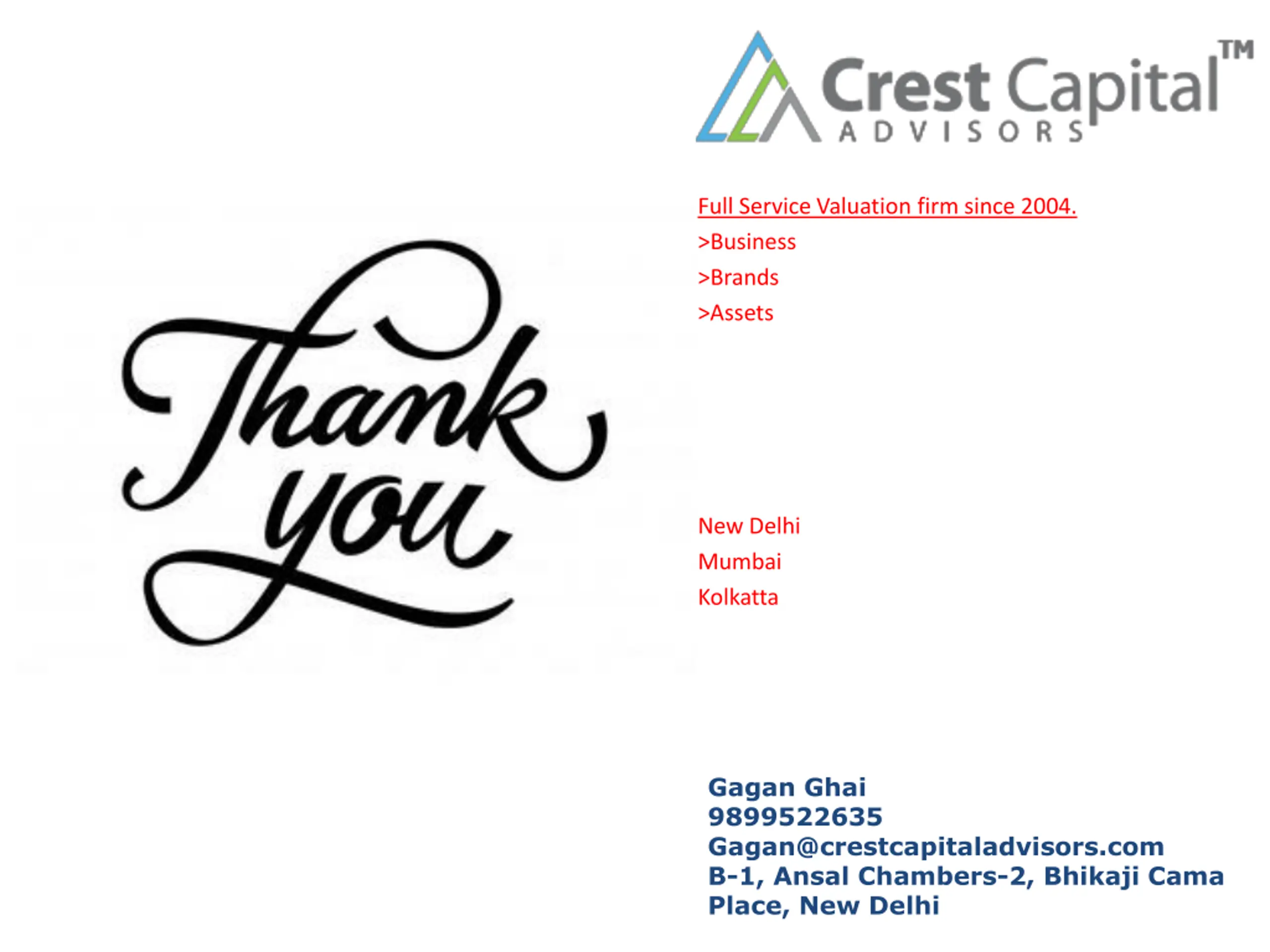 Full Service Valuation firm since 2004. >Business >Brands >Assets New Delhi Mumbai Kolkatta Gagan Ghai 9899522635 Gagan@crestcapitaladvisors.com B-1, Ansal Chambers-2, Bhikaji Cama Place, New Delhi