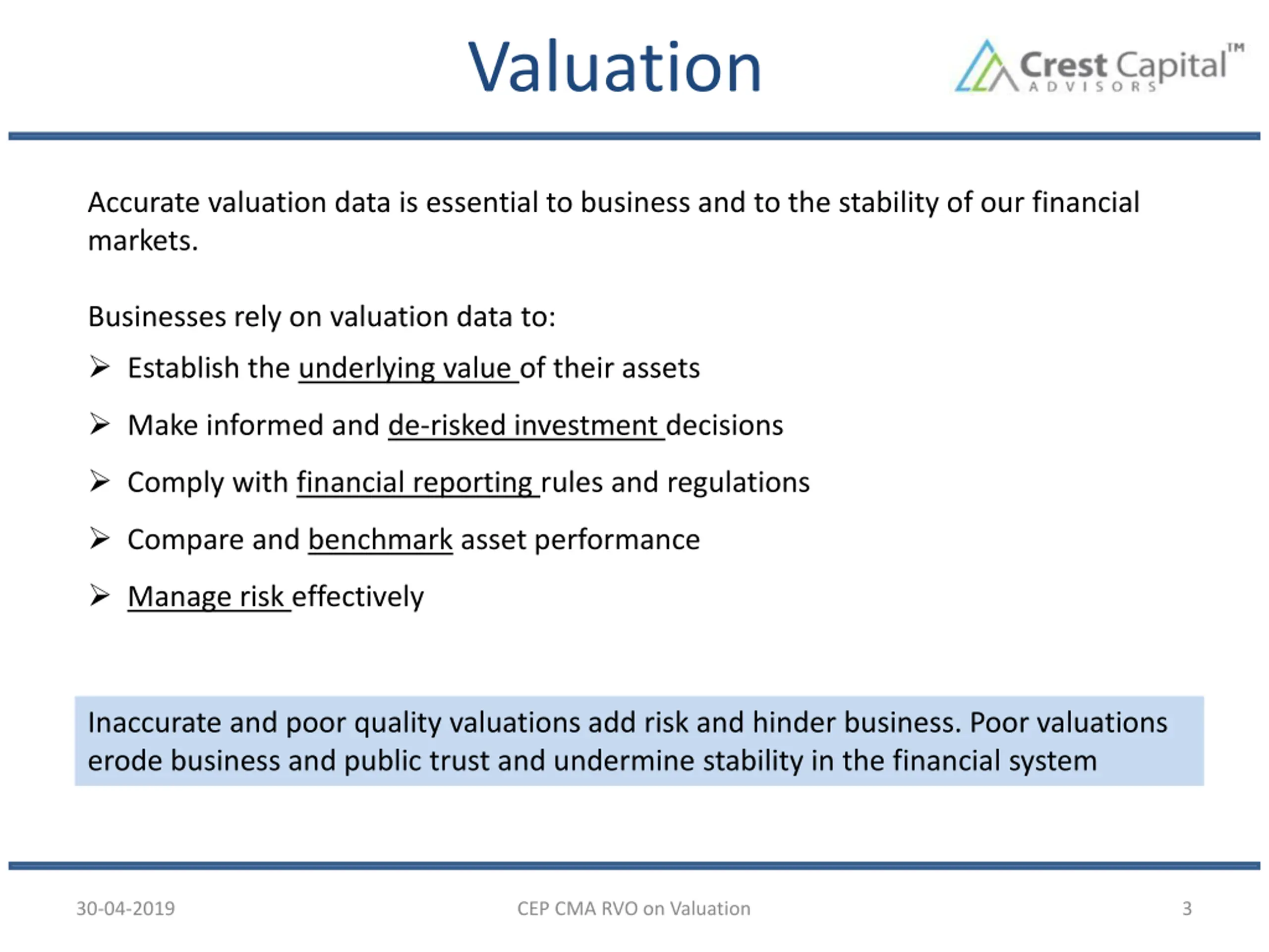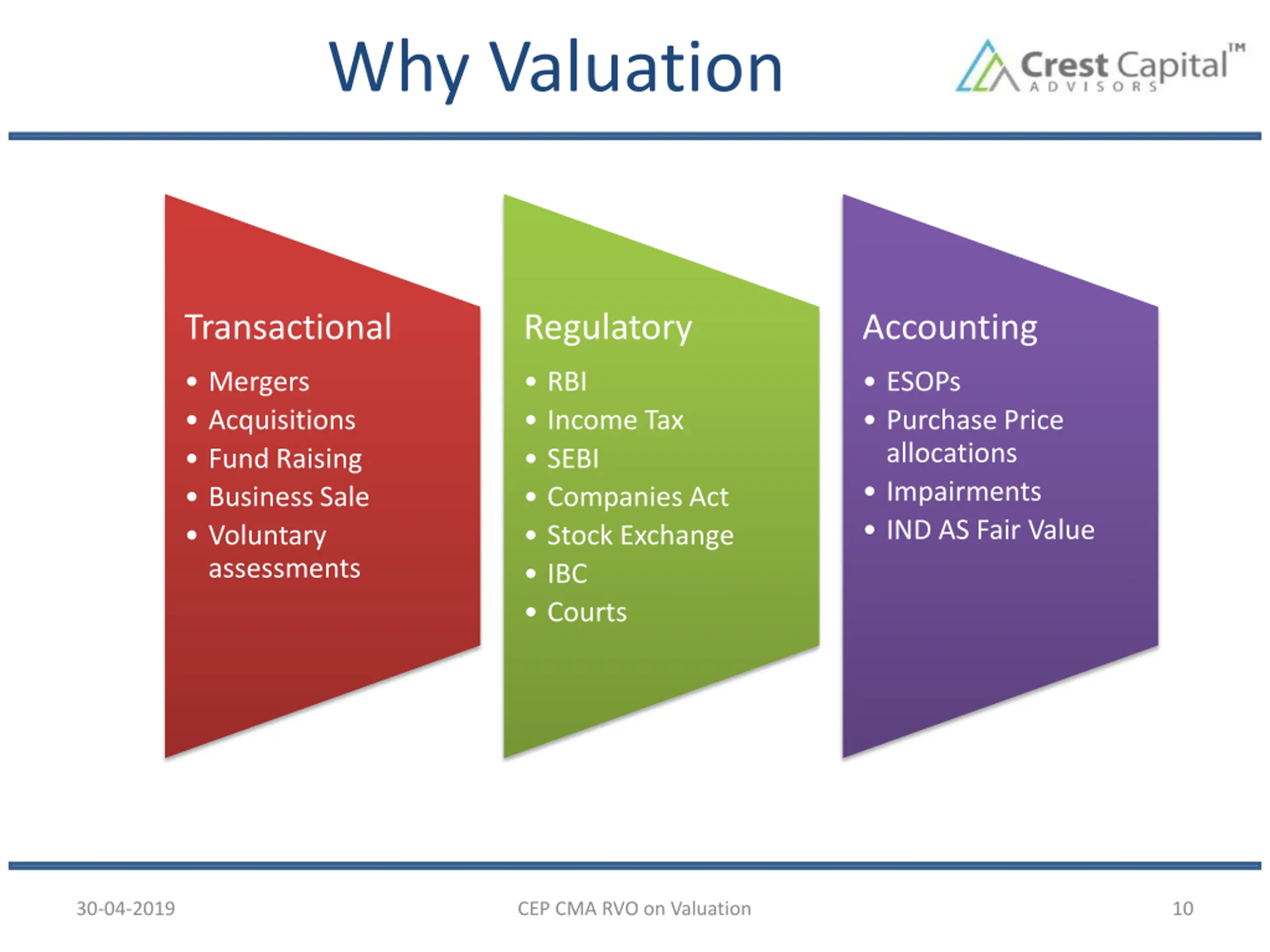 Why Valuation Transactional Regulatory Accounting Mergers Acquisitions Fund Raising Business Sale Voluntary assessments RBI Income Tax SEBI Companies Act Stock Exchange IBC Courts ESOPs Purchase Price allocations Impairments IND AS Fair Value 30-04-2019 CEP CMA RVO on Valuation 10