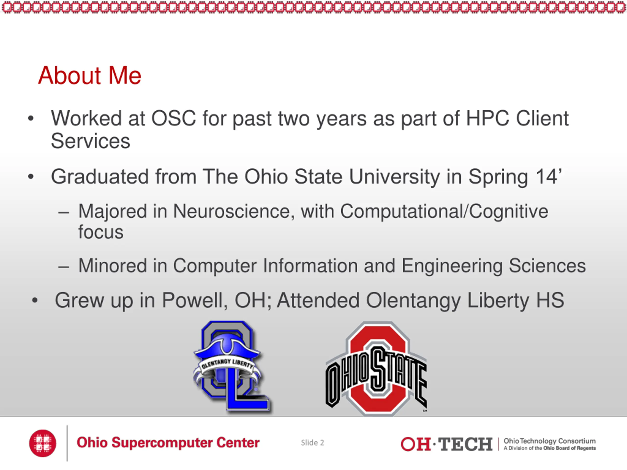 About Me Worked at OSC for past two years as part of HPC Client Services Graduated from The Ohio State University in Spring 14 Majored in Neuroscience, with Computational/Cognitive focus Minored in Computer Information and Engineering Sciences Grew up in Powell, OH; Attended Olentangy Liberty HS Slide 2
