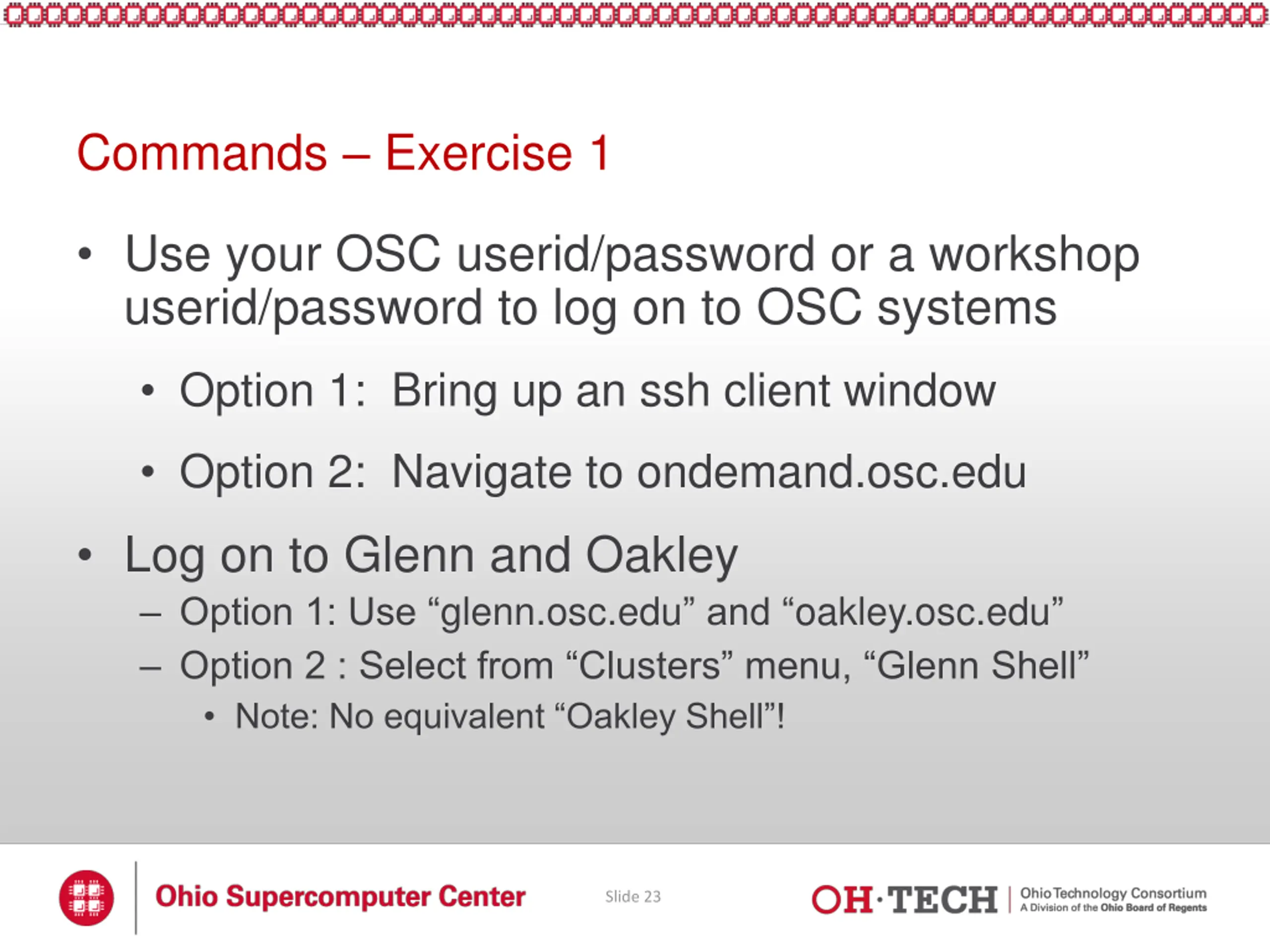 Commands Exercise 1 Use your OSC userid/password or a workshop userid/password to log on to OSC systems Option 1: Bring up an ssh client window Option 2: Navigate to ondemand.osc.edu Log on to Glenn and Oakley Option 1: Use glenn.osc.edu and oakley.osc.edu Option 2 : Select from Clusters menu, Glenn Shell Note: No equivalent Oakley Shell ! Slide 23