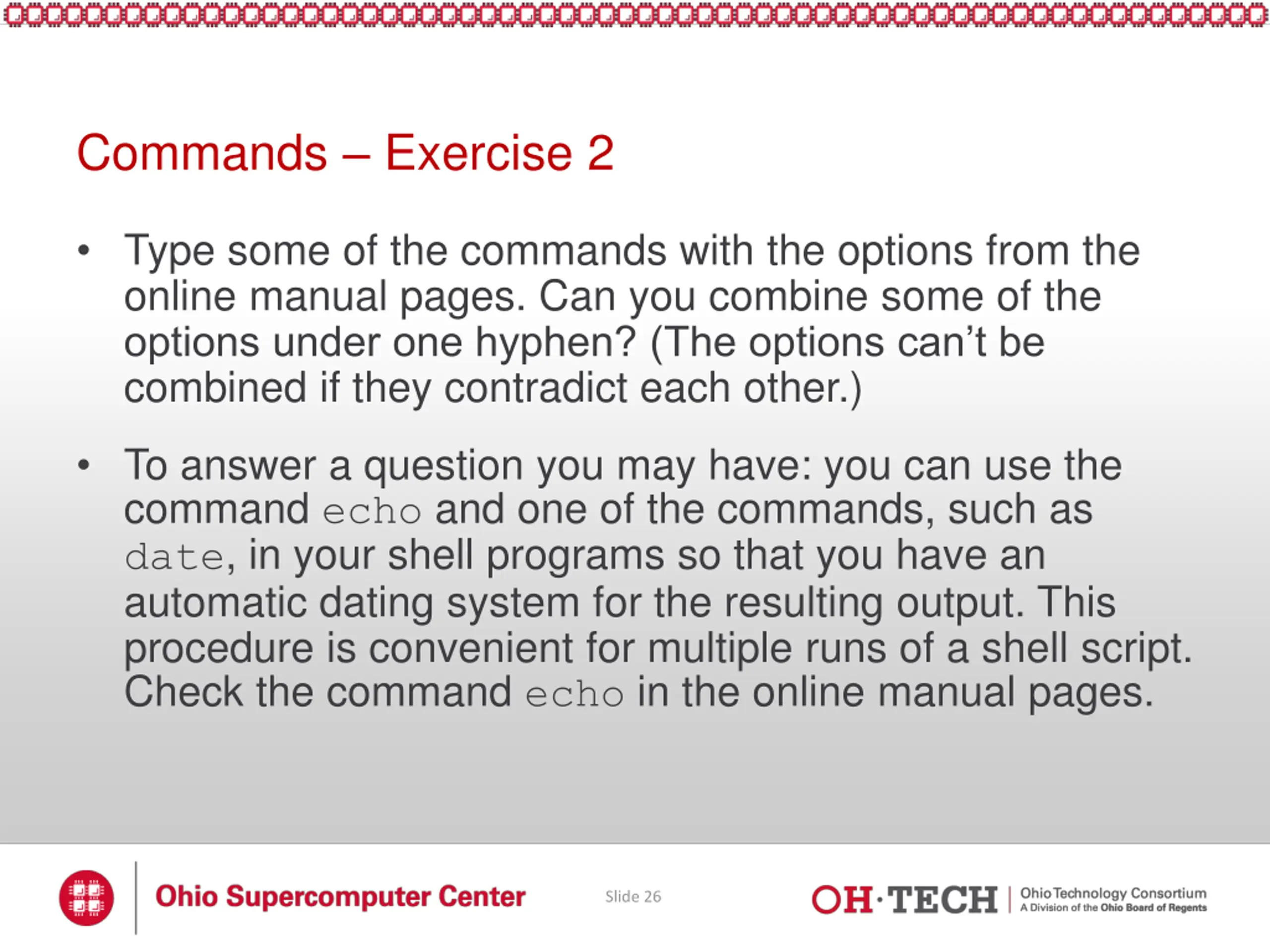 Commands Exercise 2 Type some of the commands with the options from the online manual pages. Can you combine some of the options under one hyphen? (The options can t be combined if they contradict each other.) To answer a question you may have: you can use the command echo and one of the commands, such as date, in your shell programs so that you have an automatic dating system for the resulting output. This procedure is convenient for multiple runs of a shell script. Check the command echo in the online manual pages. Slide 26