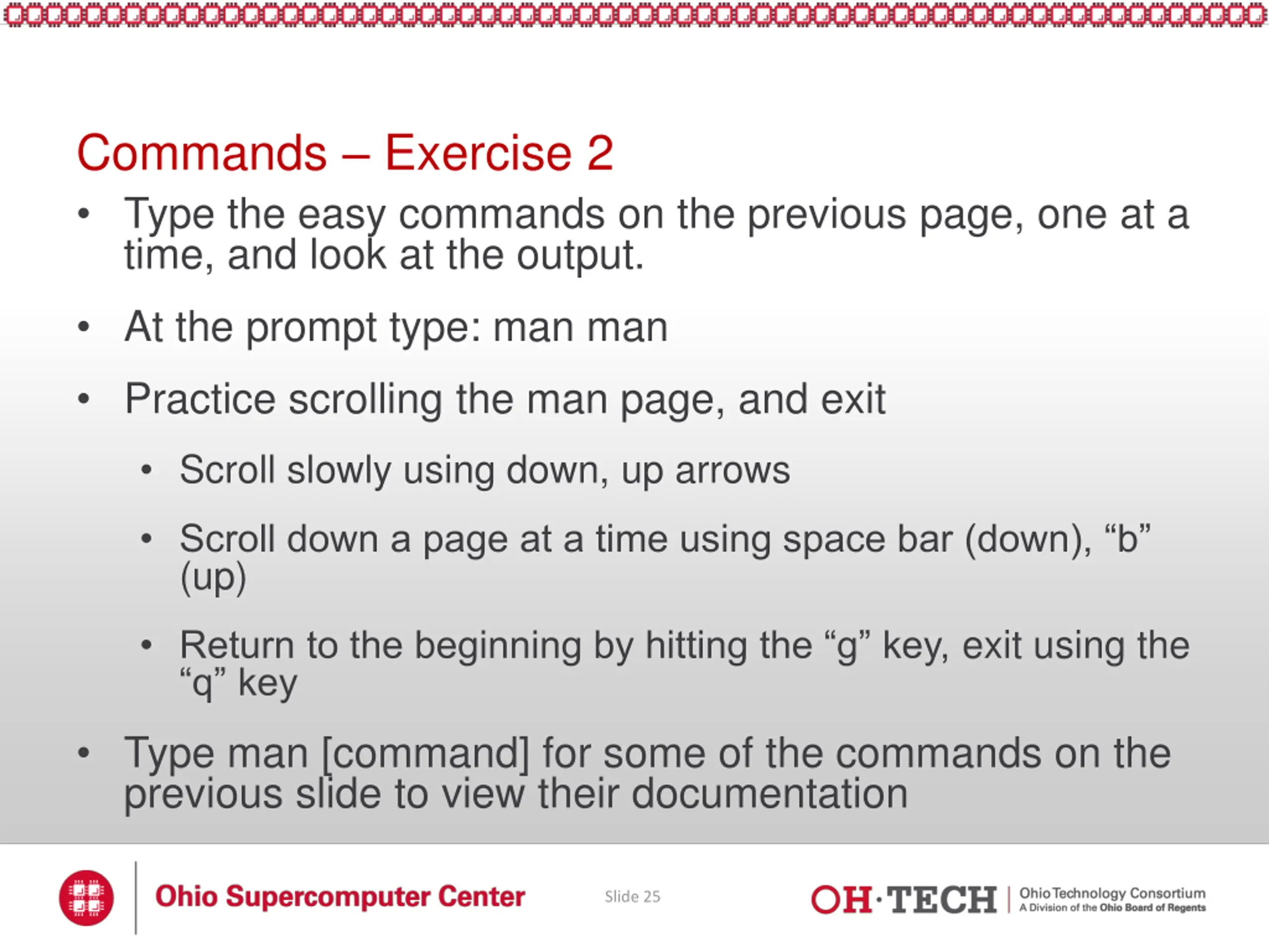 Commands Exercise 2 Type the easy commands on the previous page, one at a time, and look at the output. At the prompt type: man man Practice scrolling the man page, and exit Scroll slowly using down, up arrows Scroll down a page at a time using space bar (down), b (up) Return to the beginning by hitting the g key, exit using the q key Type man [command] for some of the commands on the previous slide to view their documentation Slide 25