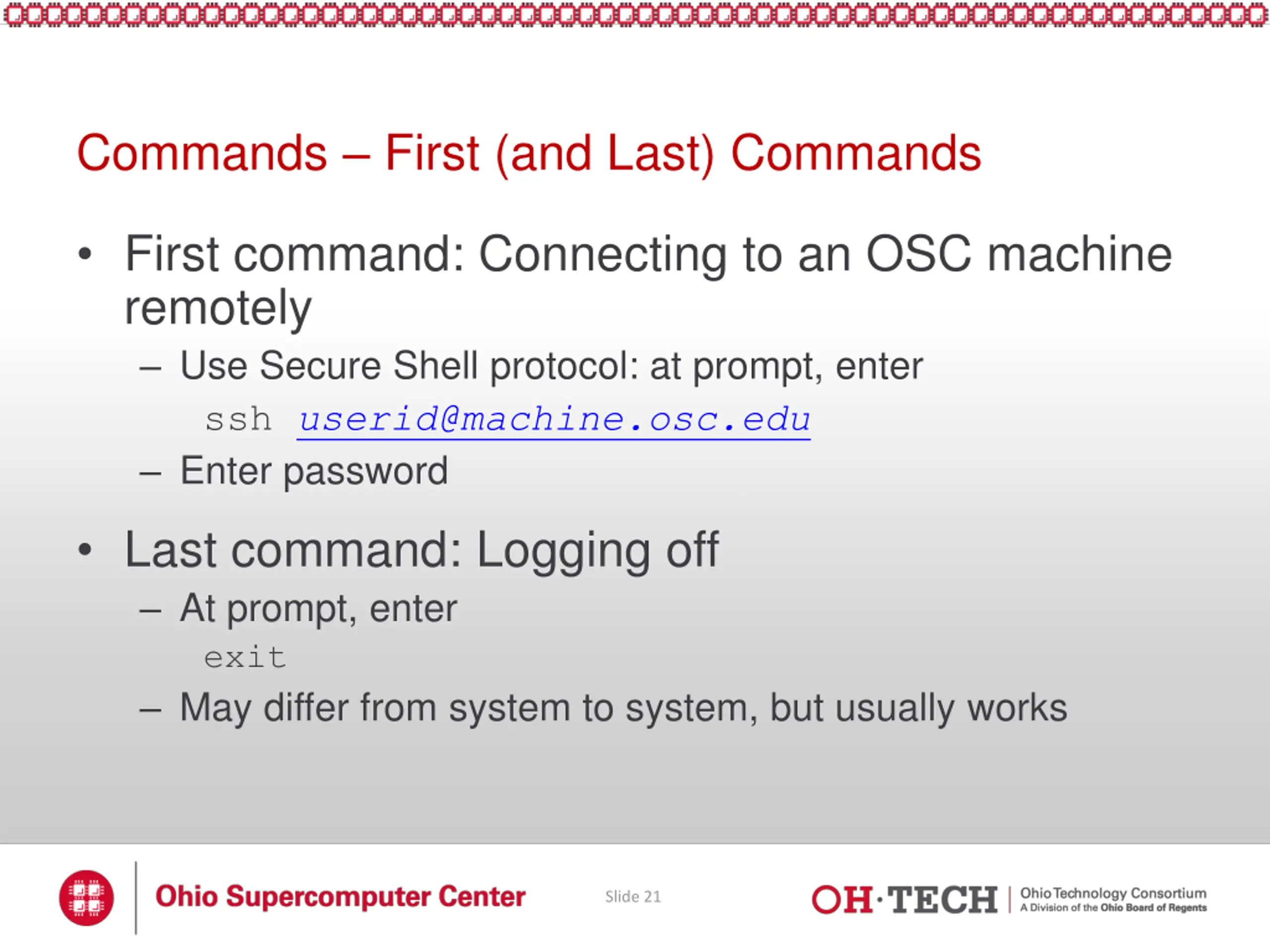 Commands First (and Last) Commands First command: Connecting to an OSC machine remotely Use Secure Shell protocol: at prompt, enter ssh userid@machine.osc.edu Enter password Last command: Logging off At prompt, enter exit May differ from system to system, but usually works Slide 21
