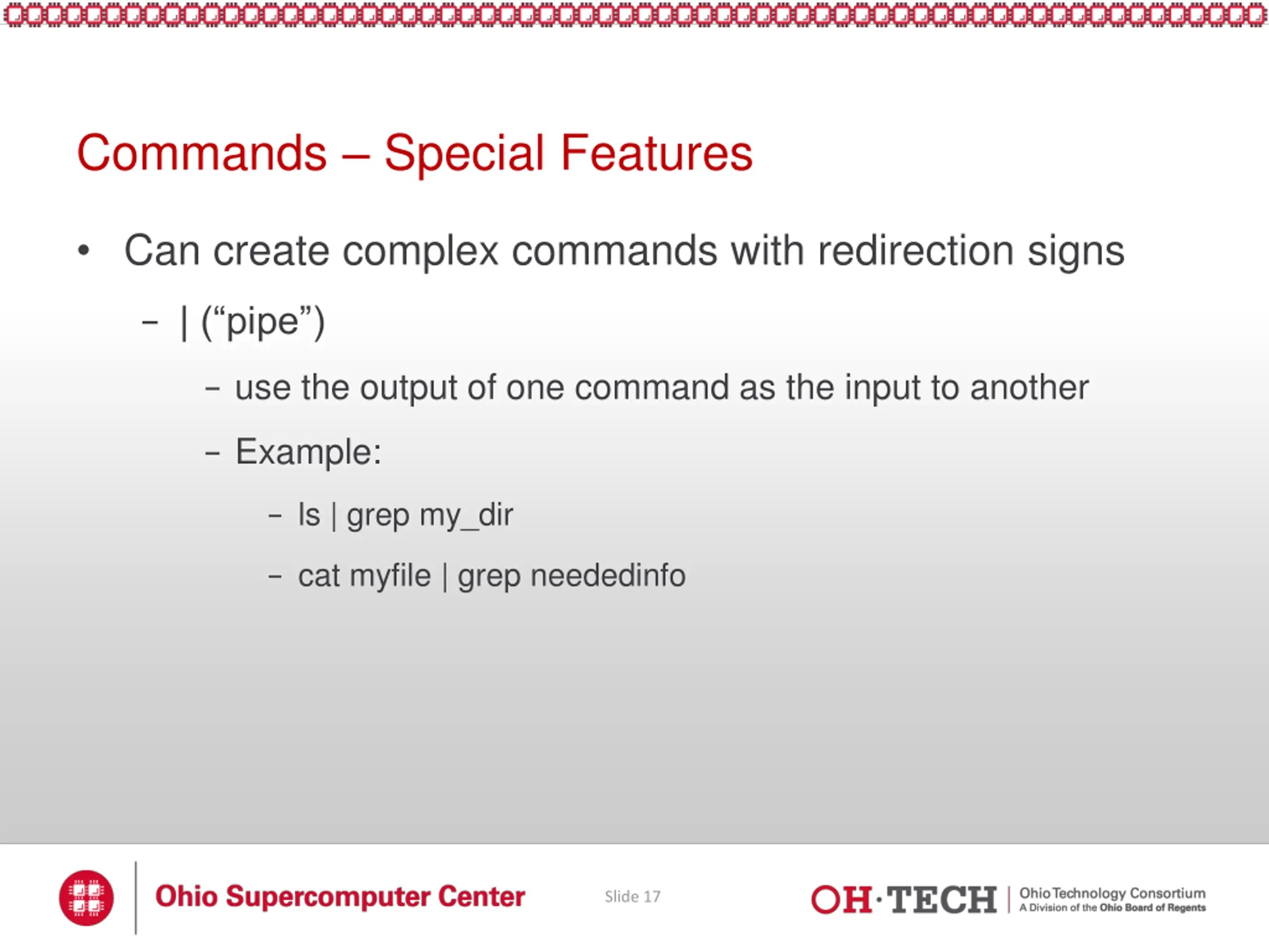 Commands Special Features Can create complex commands with redirection signs - | ( pipe ) - use the output of one command as the input to another - Example: - ls | grep my_dir - cat myfile | grep neededinfo Slide 17