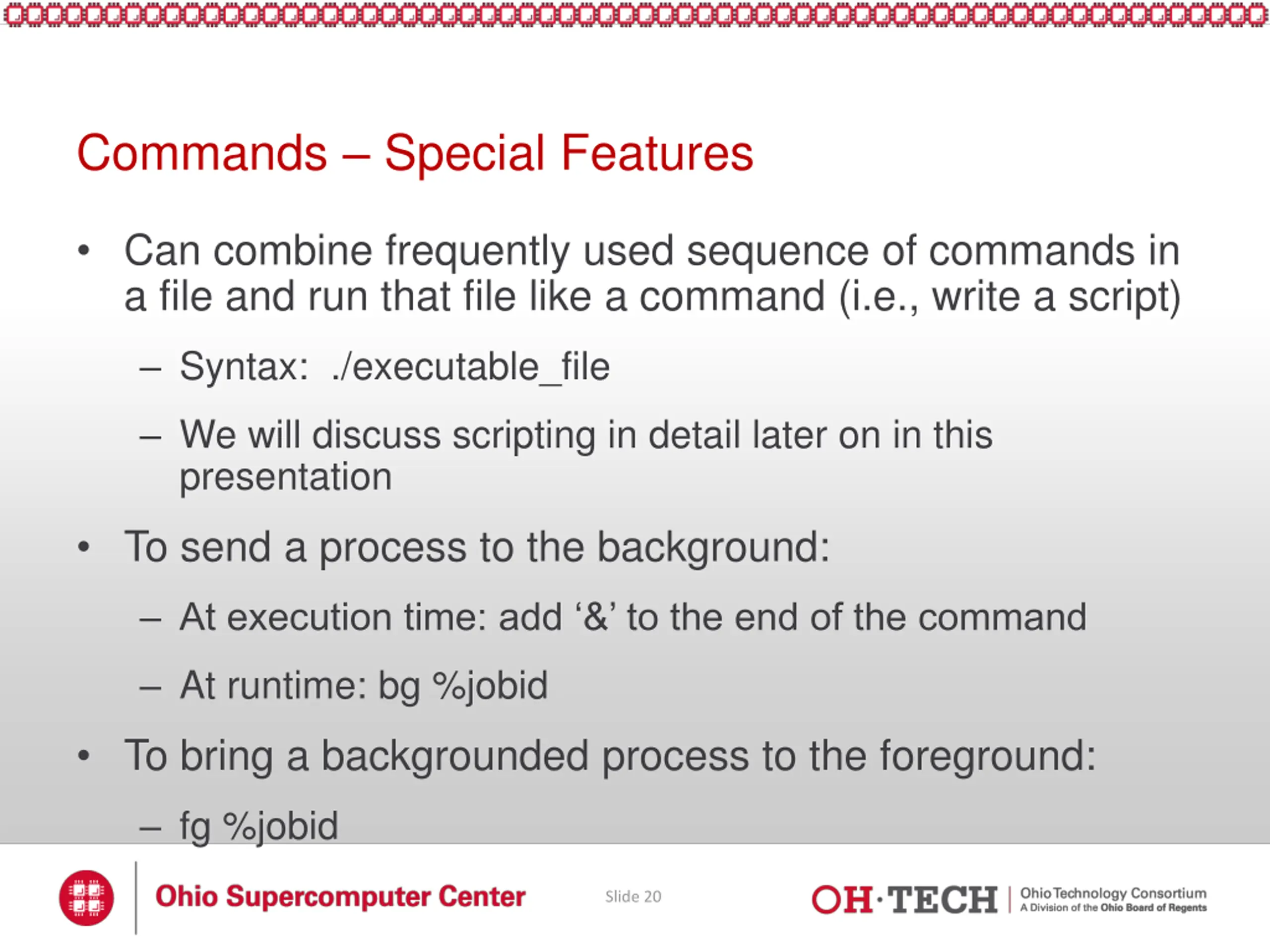 Commands Special Features Can combine frequently used sequence of commands in a file and run that file like a command (i.e., write a script) Syntax: ./executable_file We will discuss scripting in detail later on in this presentation To send a process to the background: At execution time: add & to the end of the command At runtime: bg %jobid To bring a backgrounded process to the foreground: fg %jobid Slide 20