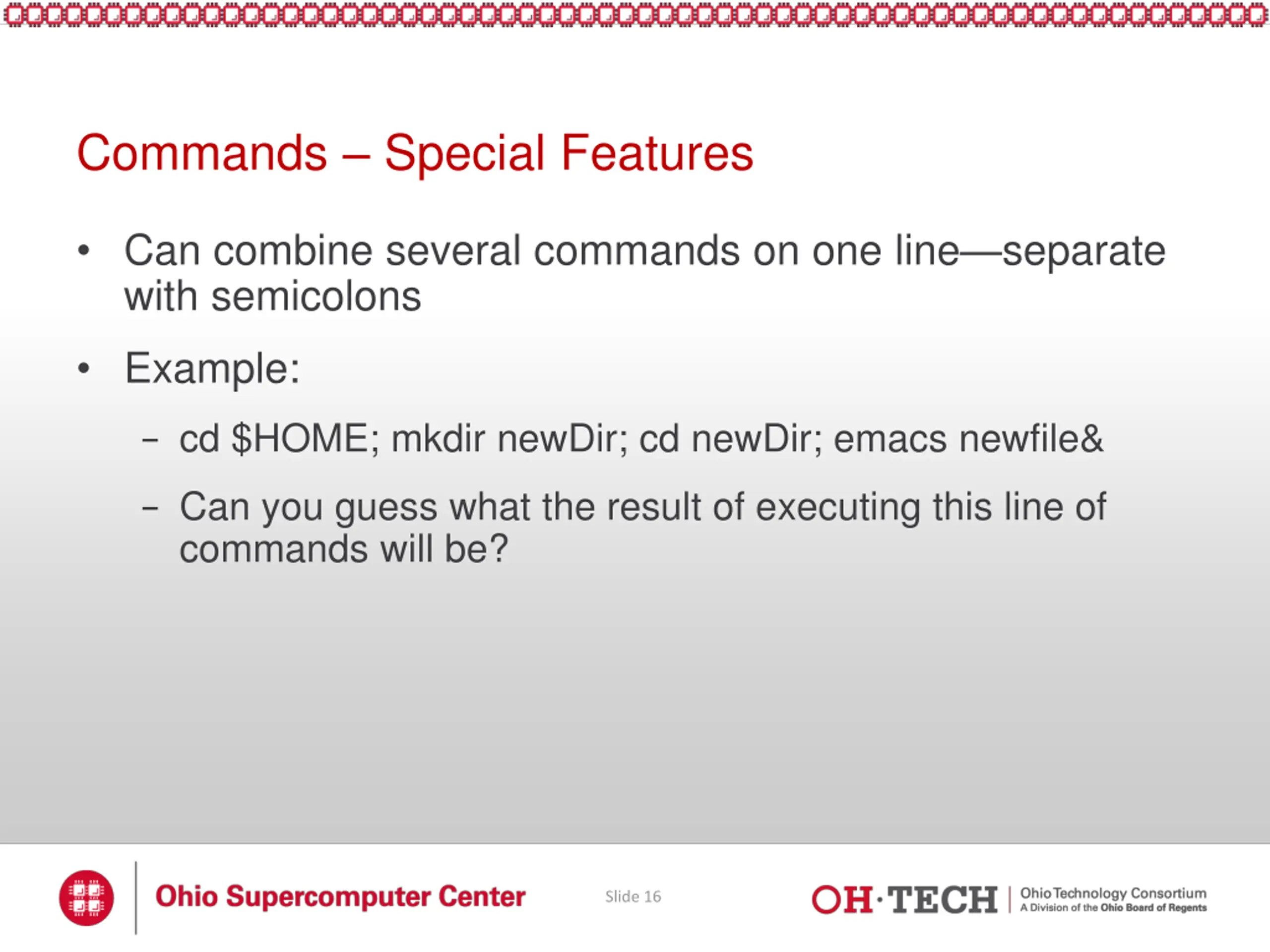 Commands Special Features Can combine several commands on one line separate with semicolons Example: - cd $HOME; mkdir newDir; cd newDir; emacs newfile& - Can you guess what the result of executing this line of commands will be? Slide 16