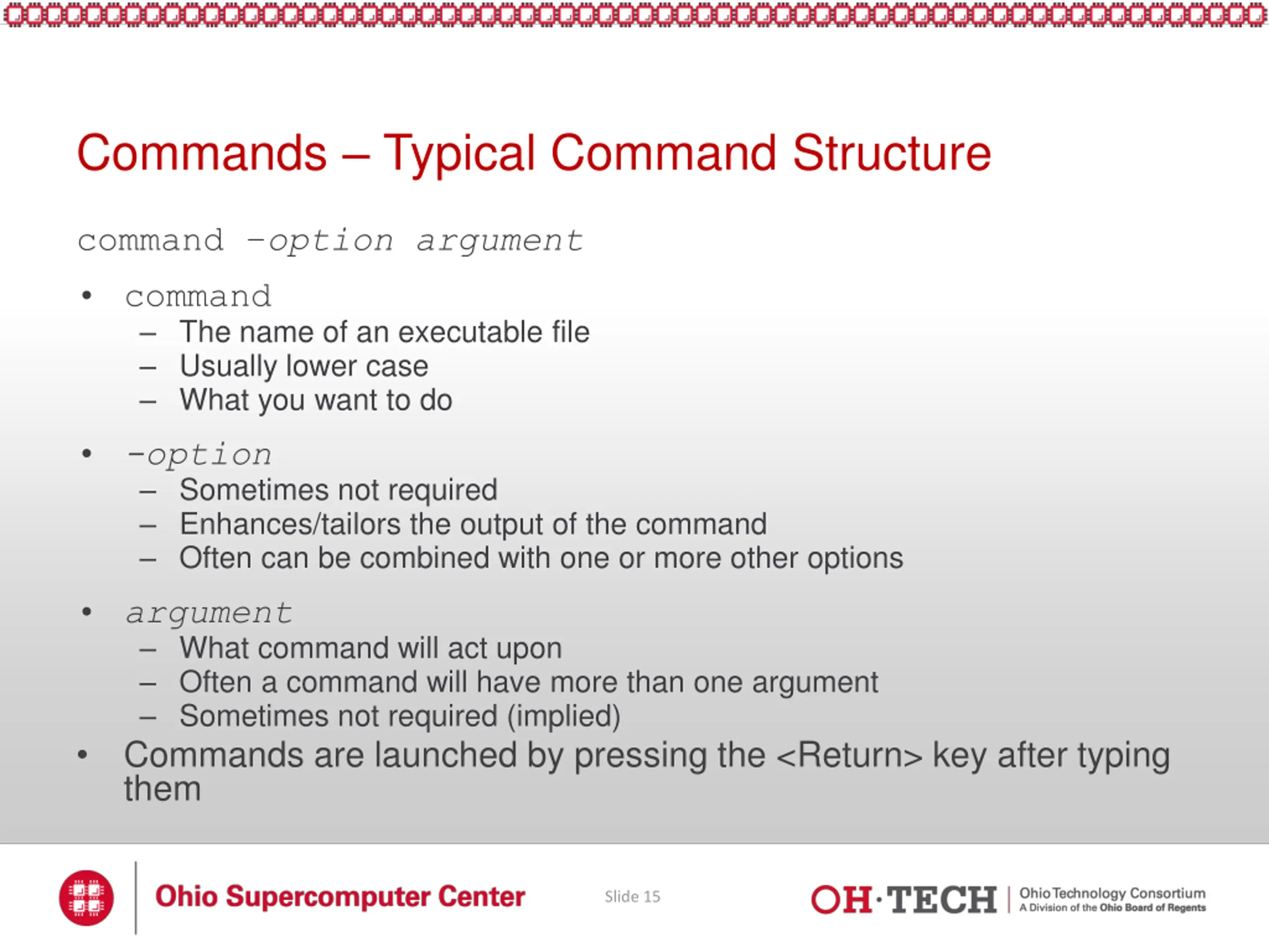 Commands Typical Command Structure command option argument command The name of an executable file Usually lower case What you want to do -option Sometimes not required Enhances/tailors the output of the command Often can be combined with one or more other options argument What command will act upon Often a command will have more than one argument Sometimes not required (implied) Commands are launched by pressing the <Return> key after typing them Slide 15