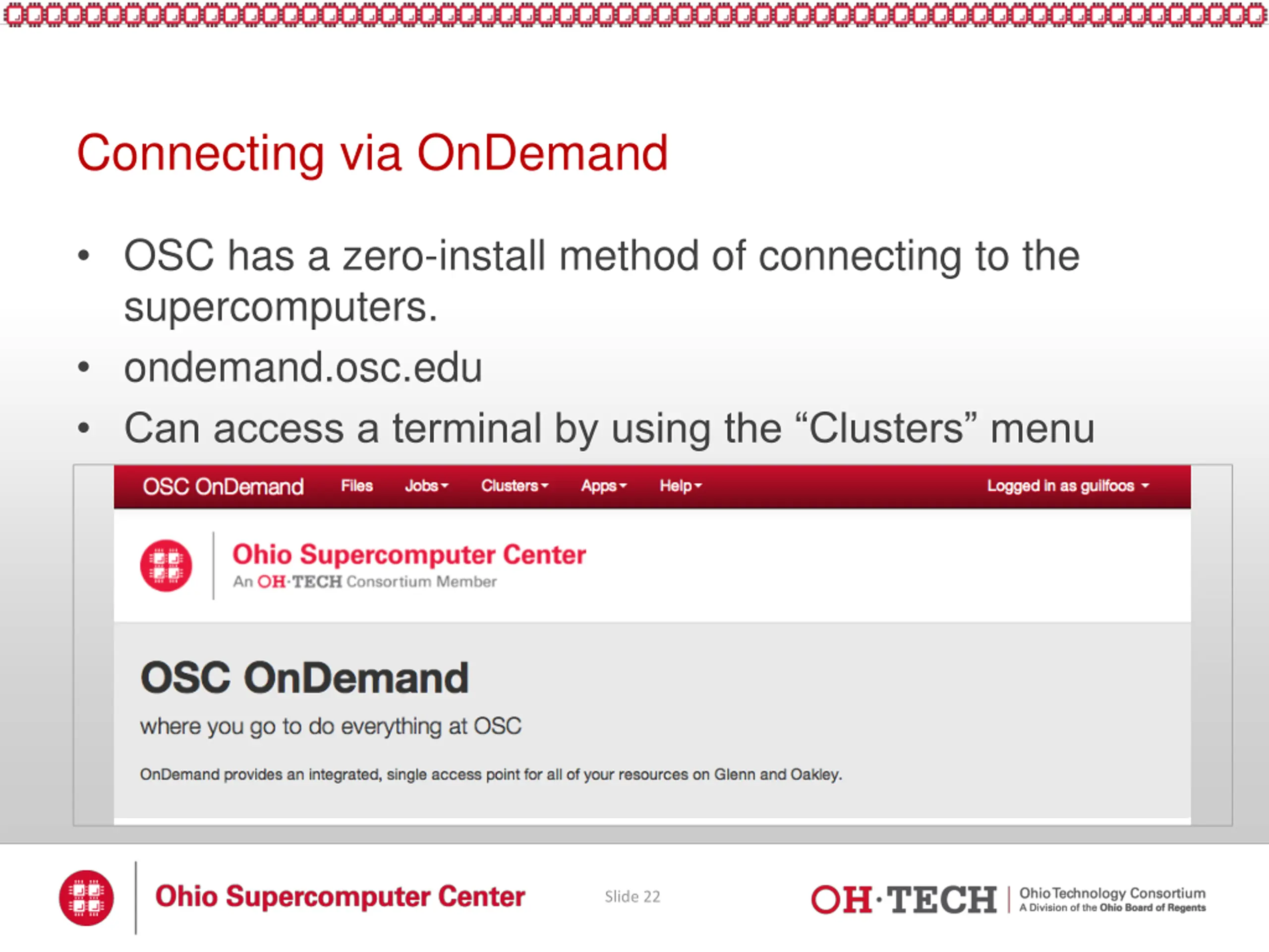Connecting via OnDemand OSC has a zero-install method of connecting to the supercomputers. ondemand.osc.edu Can access a terminal by using the Clusters menu Slide 22