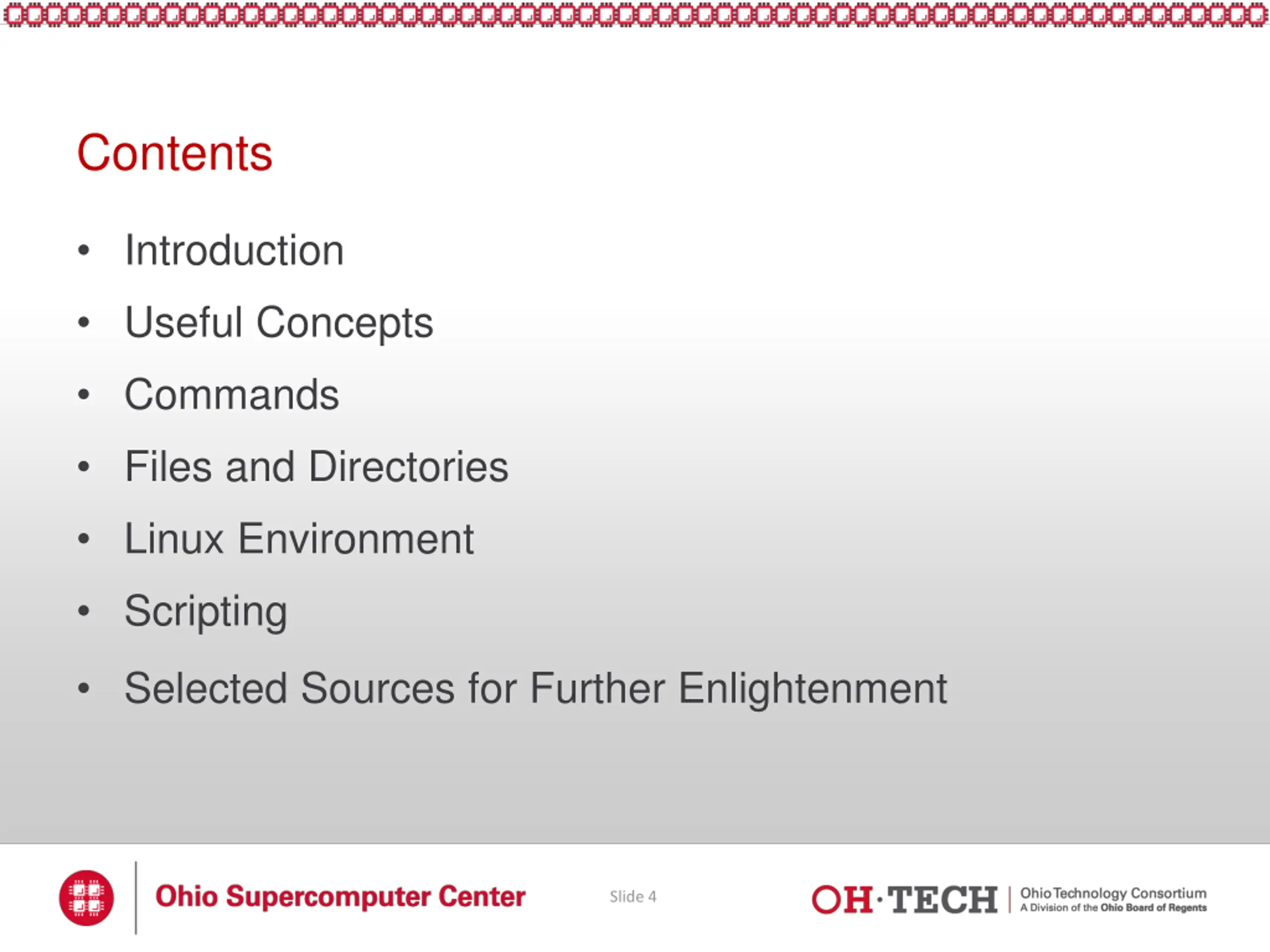 Contents Introduction Useful Concepts Commands Files and Directories Linux Environment Scripting Selected Sources for Further Enlightenment Slide 4