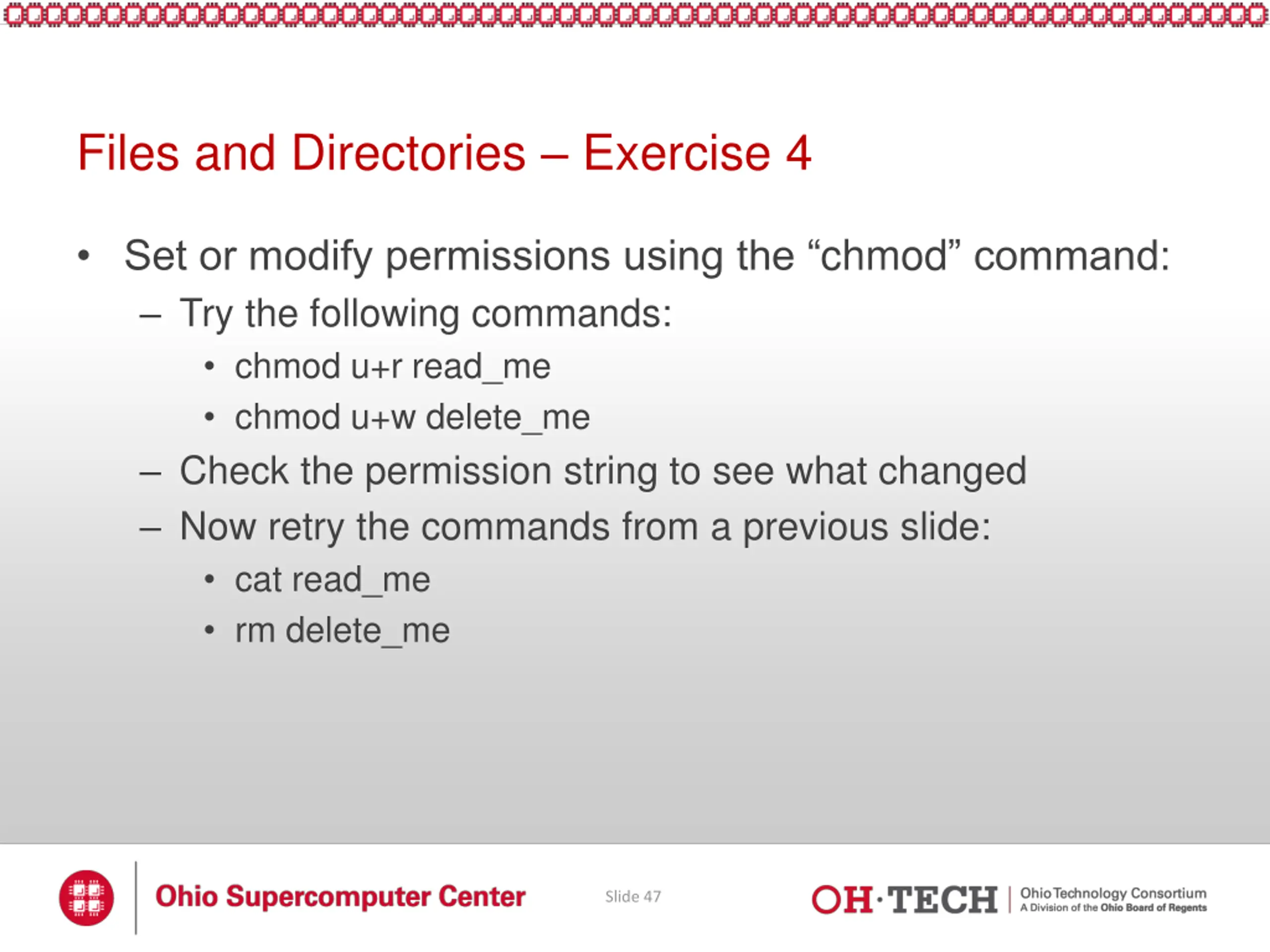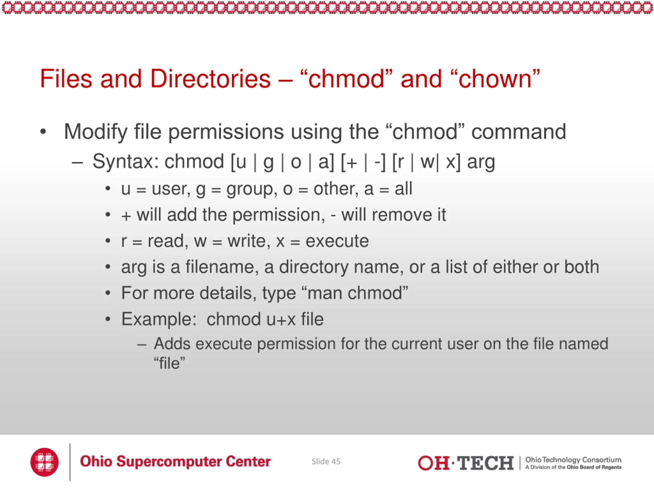 Files and Directories chmod and chown Change file or directory ownership using chown Syntax: chown new_owner file_or_directory new_owner = the new owner s username file_or_directory = the file or directory you d like to change the ownership of Probably won t use as much as chmod , but still good to know May not have permission to use this command on OSC systems chmod will likely be all you need Slide 46