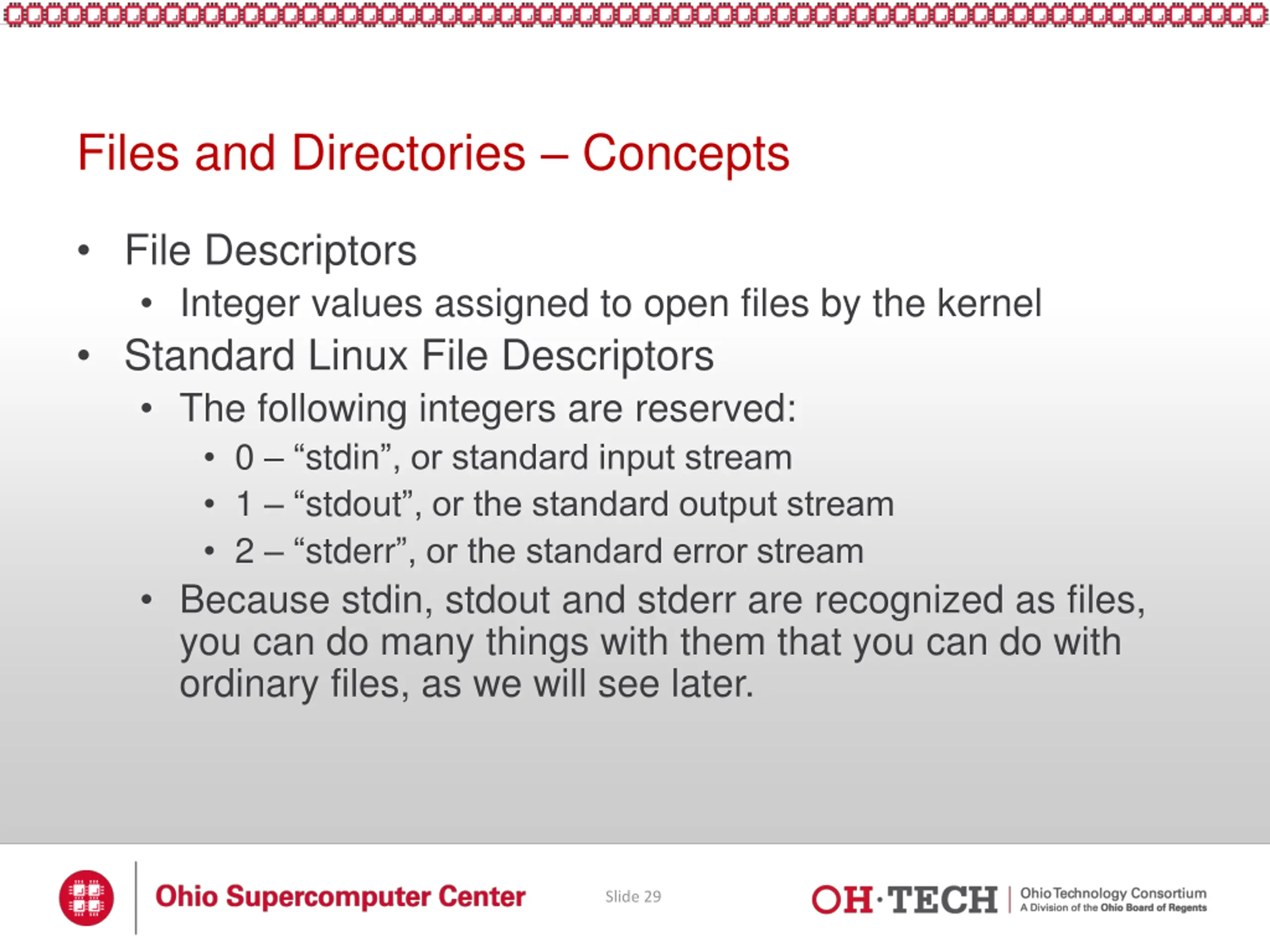 Files and Directories Concepts File Descriptors Integer values assigned to open files by the kernel Standard Linux File Descriptors The following integers are reserved: 0 stdin , or standard input stream 1 stdout , or the standard output stream 2 stderr , or the standard error stream Because stdin, stdout and stderr are recognized as files, you can do many things with them that you can do with ordinary files, as we will see later. Slide 29