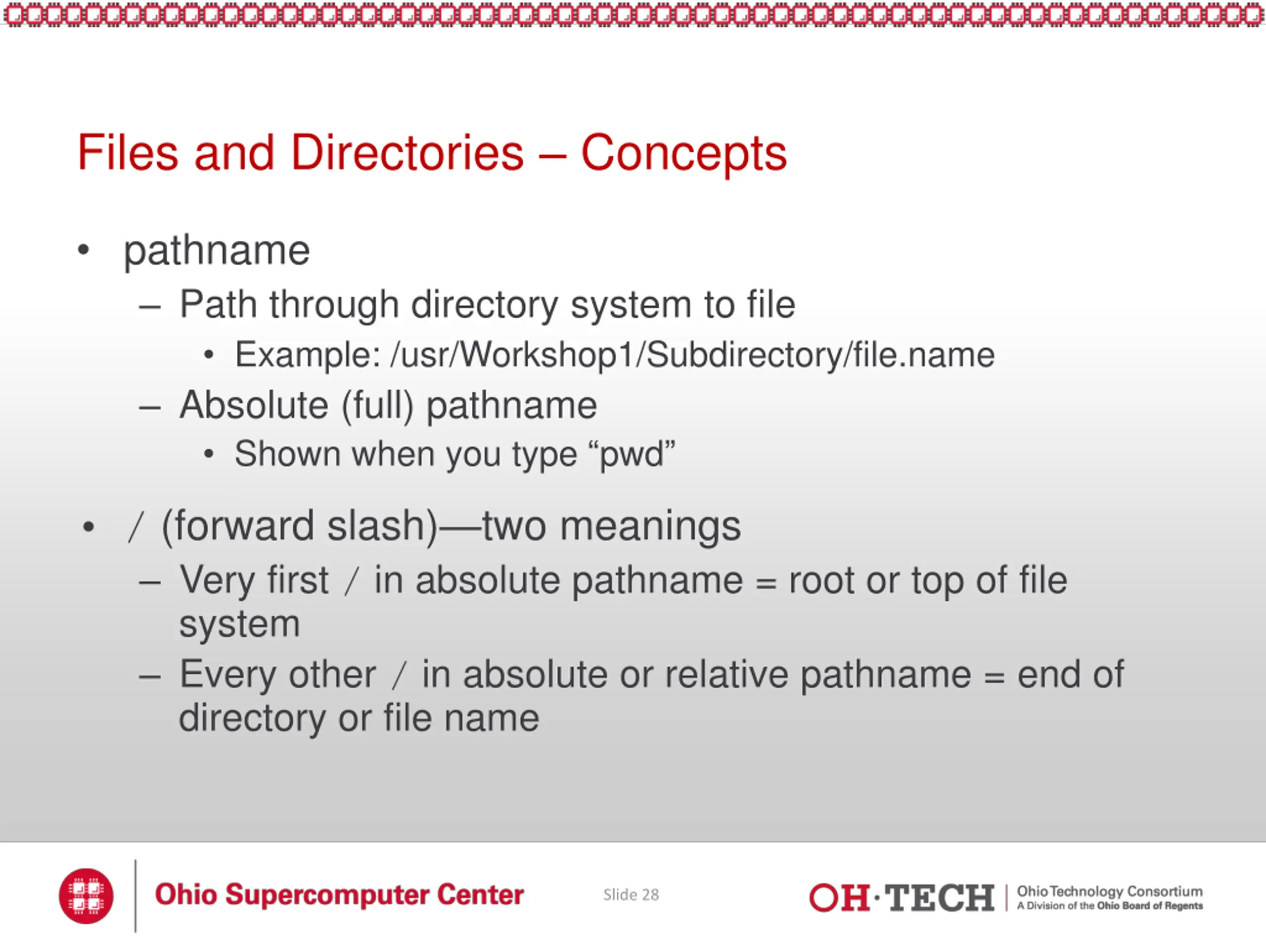 Files and Directories Concepts pathname Path through directory system to file Example: /usr/Workshop1/Subdirectory/file.name Absolute (full) pathname Shown when you type pwd / (forward slash) two meanings Very first / in absolute pathname = root or top of file system Every other / in absolute or relative pathname = end of directory or file name Slide 28