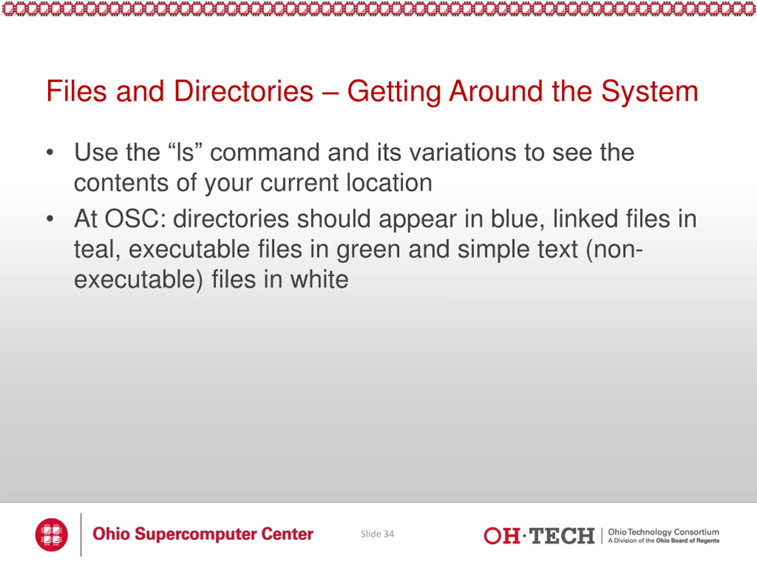 Files and Directories Getting Around the System Use the ls command and its variations to see the contents of your current location At OSC: directories should appear in blue, linked files in teal, executable files in green and simple text (non- executable) files in white Slide 34